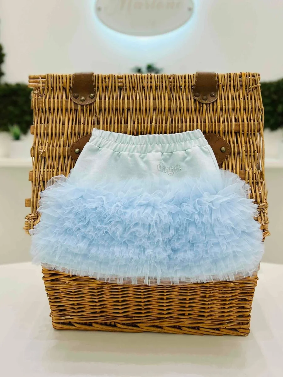Minigonna in cotone elasticizzato con balze di tulle azzurro.