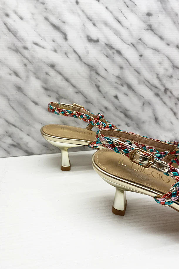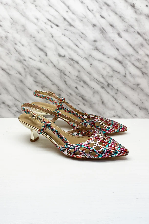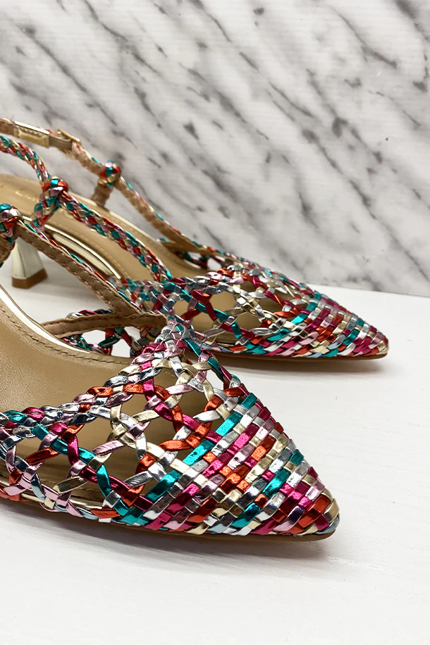 Décolleté sfilate multicolor in eco pelle laminata intrecciata, laccio posteriore con fibbia di regolazione, tacco 40mm in tinta con fondo e suola in gomma