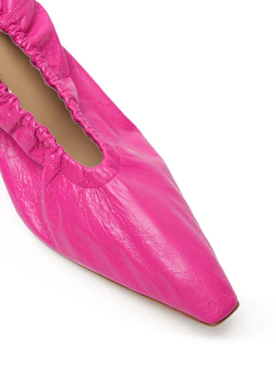 Décolleté Pump Almond in Pelle Fucsia Bottega Veneta. In nappa fucsia con effetto ‘crush’, a punta, elastico attorno alla tomaia, tacco a rocchetto in plexi con dettagli fucsia all’interno.