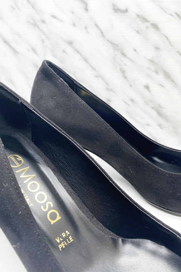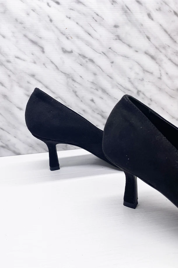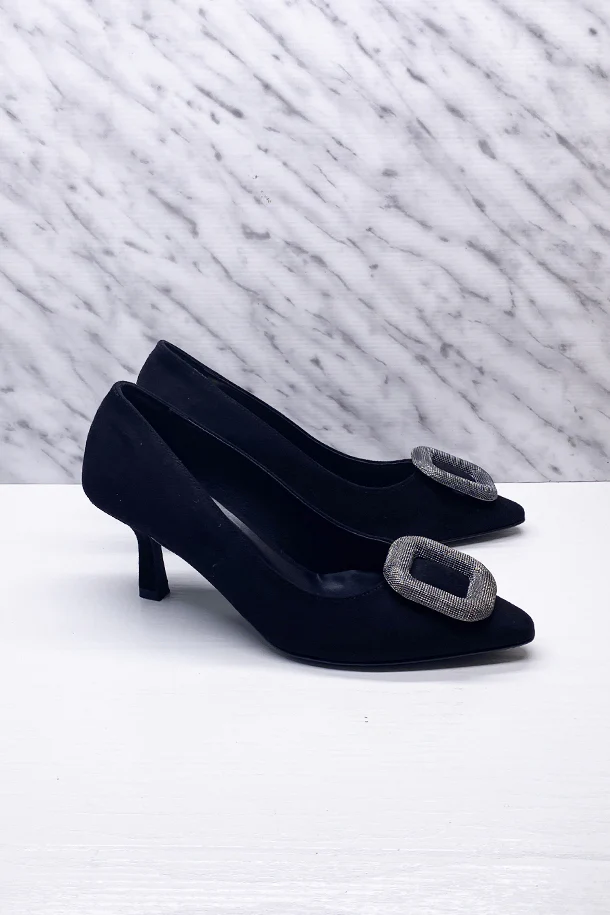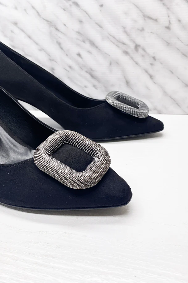 Décolleté a punta in eco pelle finitura camoscio con fibbia metallica frontale, impunture in tinta, suola interna in pelle, tacco 50mm in tinta con fondo e suola in gomma