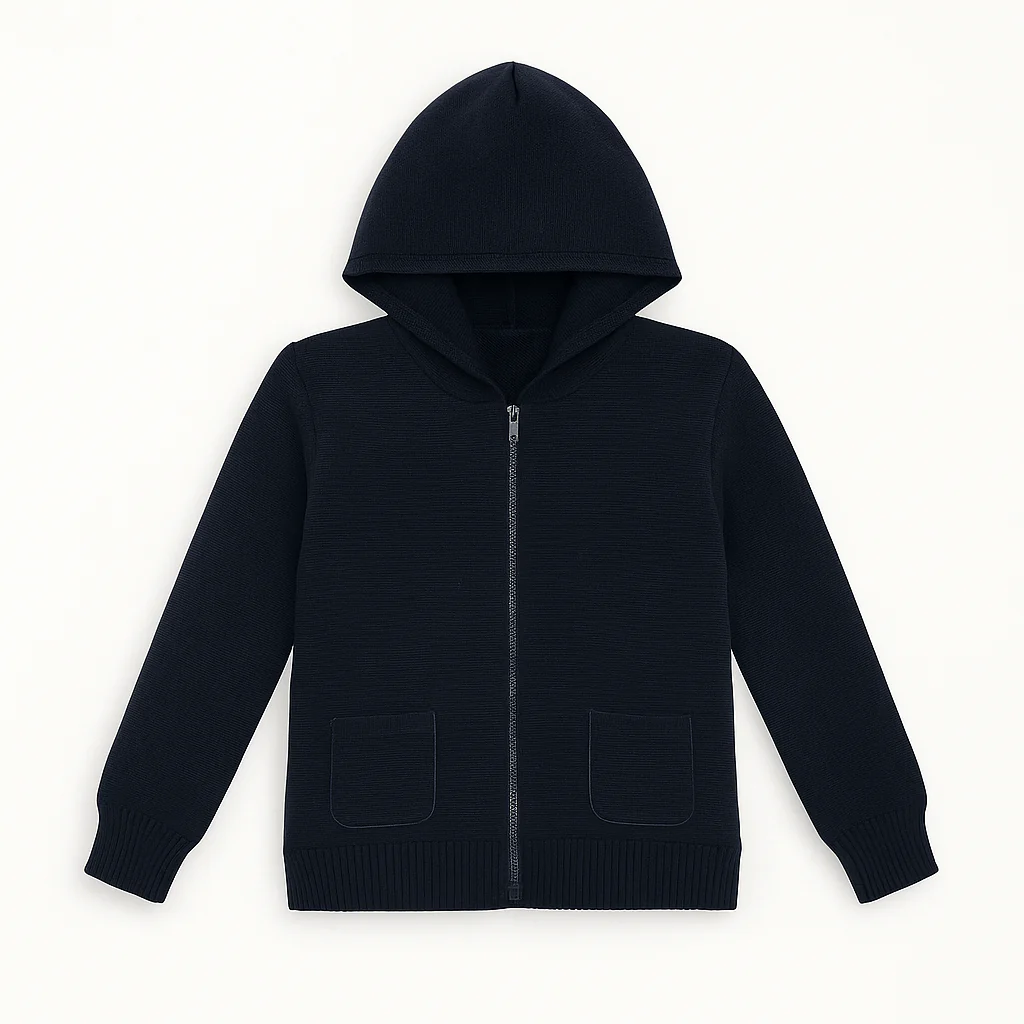 Giacca in maglia blu con cappuccio, chiusura frontale con zip, tasche applicate e finiture a coste su polsini e fondo. Struttura morbida e pratica per l’uso quotidiano.