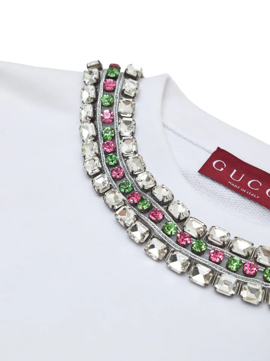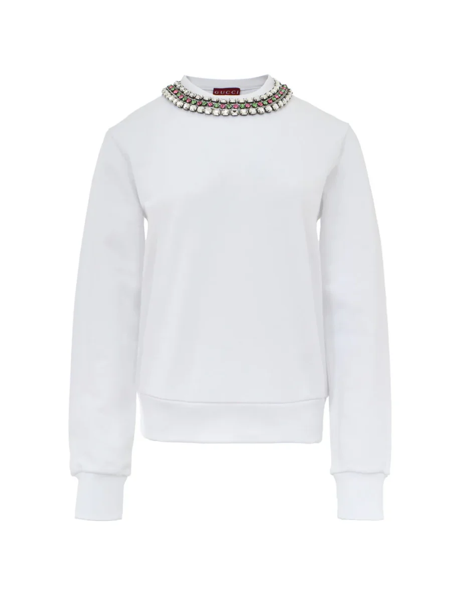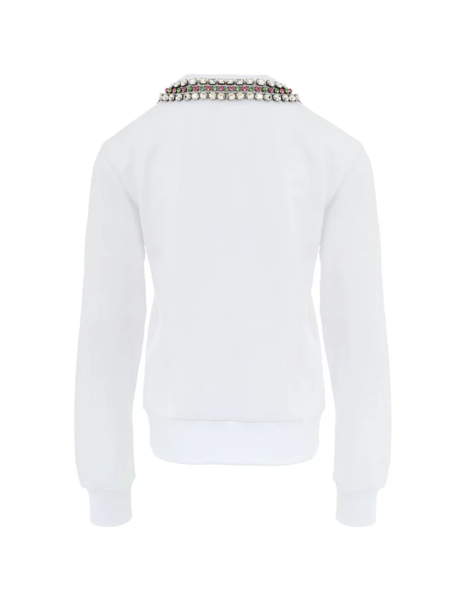 Scollo tondo, maniche lunghe, apertura sulla spalla con zip nascosta. Dettaglio collo gioiello con cristalli applicati a collana