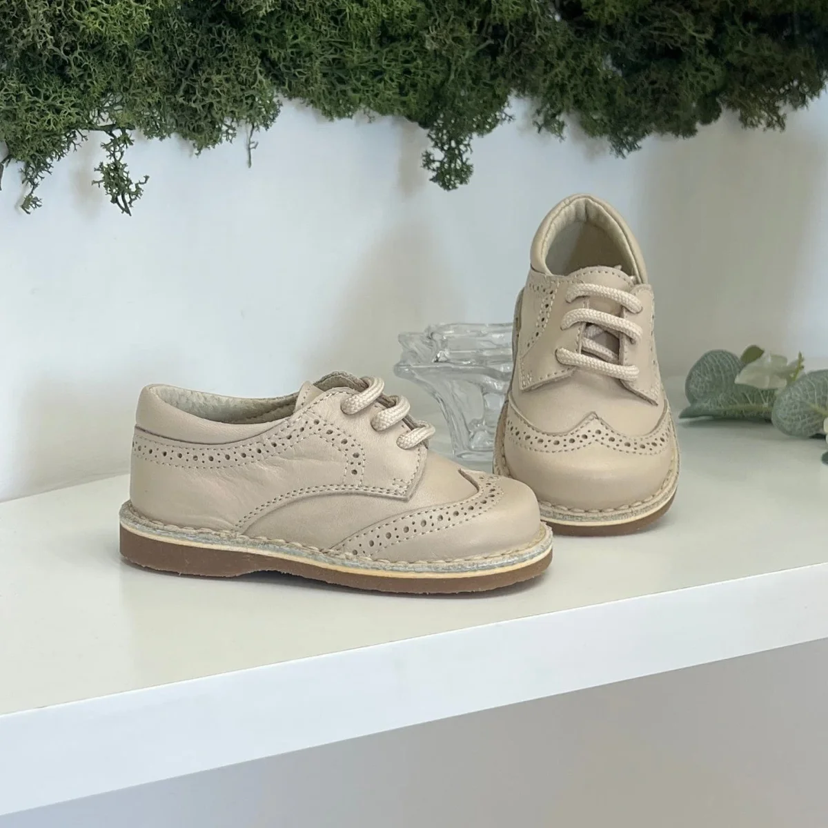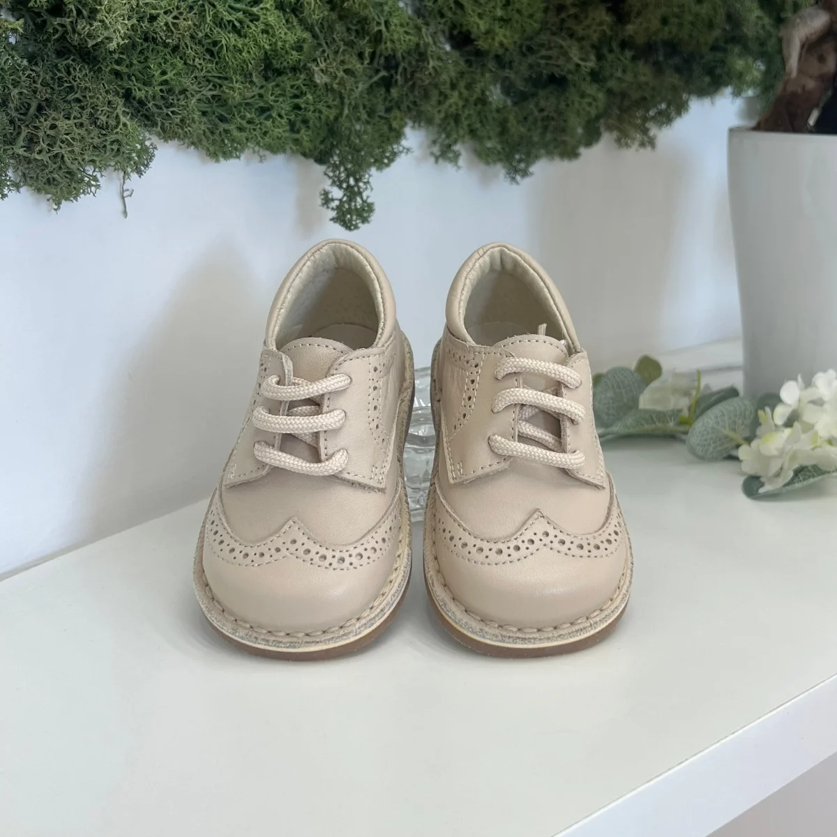 Francesina bimbo in pelle beige con trafori ed impunture, suola in gomma antiscivolo.