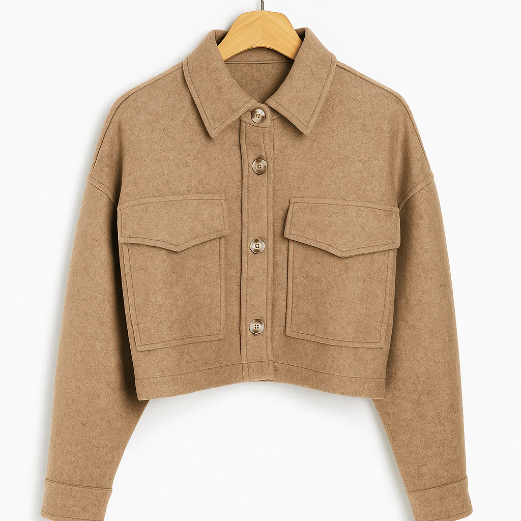 Giacca in tessuto effetto feltro, dal taglio corto e linee pulite. Presenta colletto classico, bottoni a vista e maxi tasche applicate sul davanti. Un capo essenziale e moderno, ideale per completare con eleganza i look di stagione.