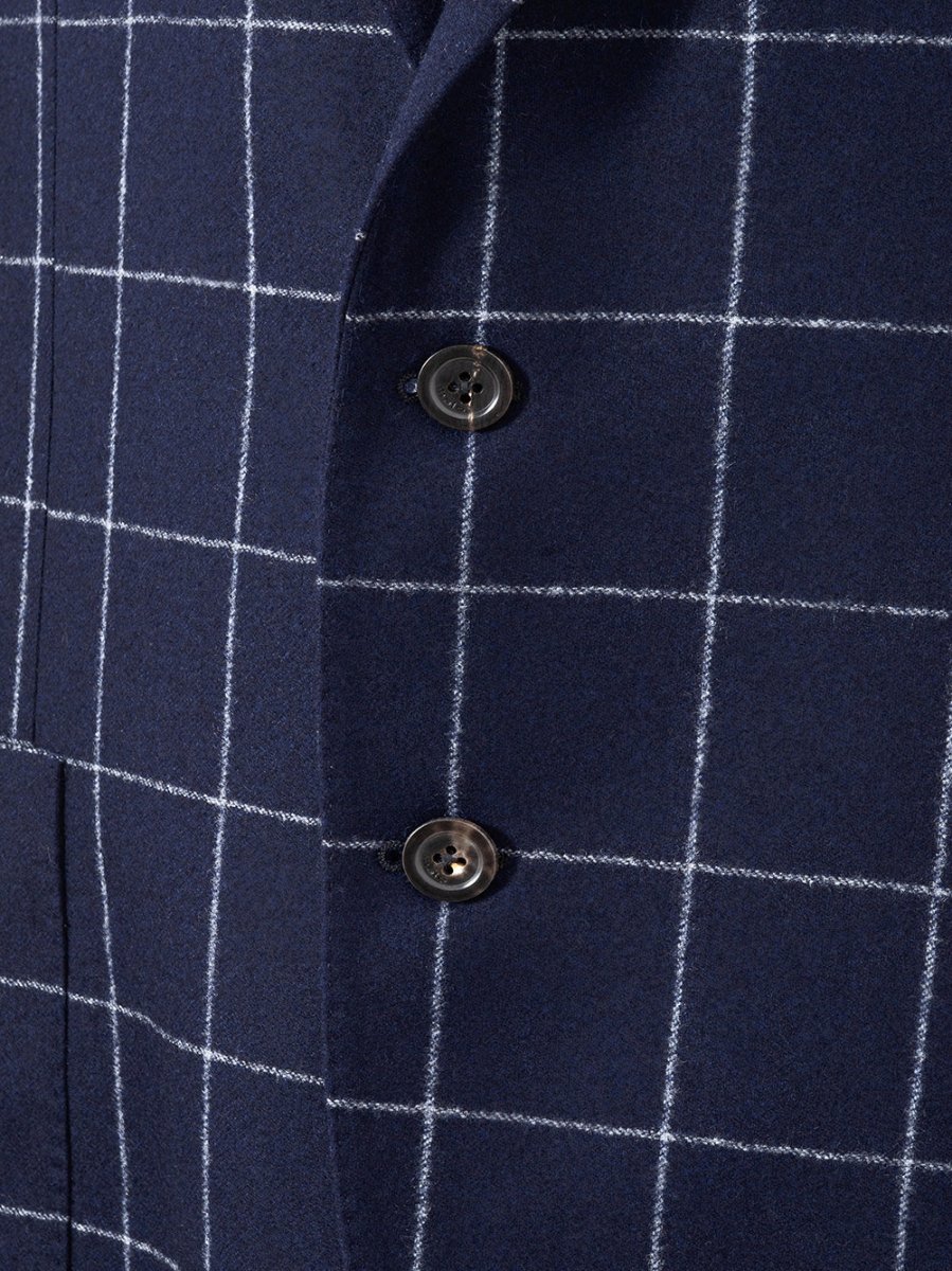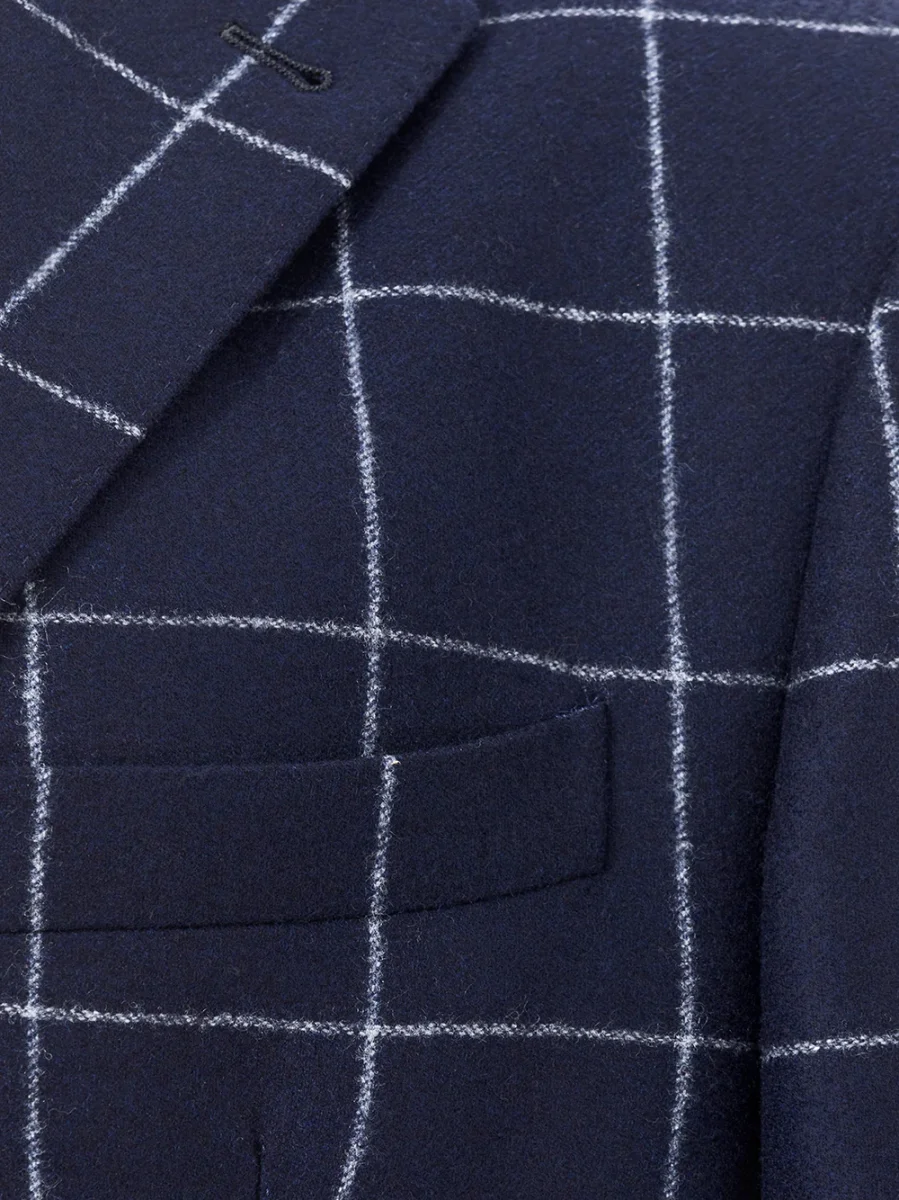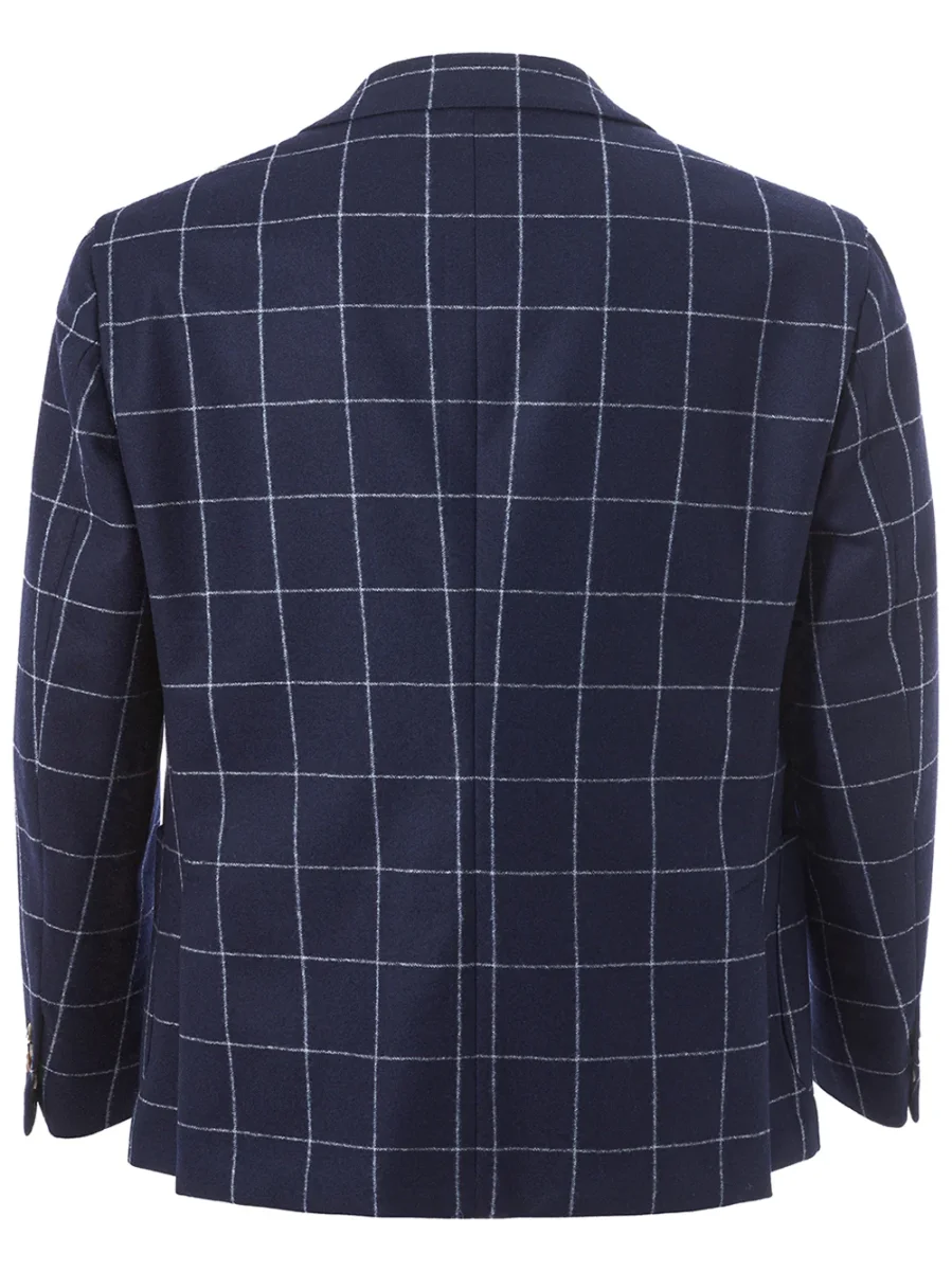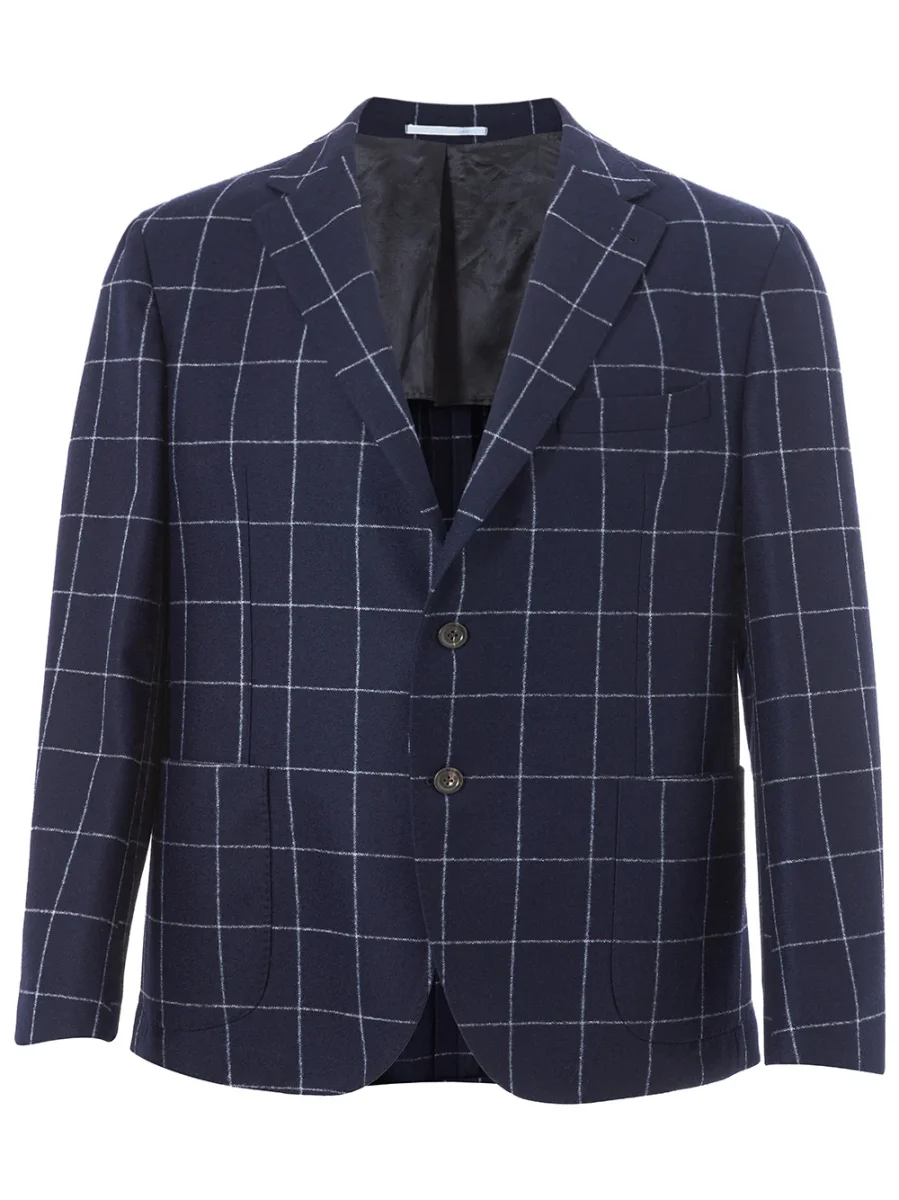 Giacca in lana blu a quadri a contrasto, chiusura frontale con due bottoni, due tasche frontali applicate e taschino. Due tasche interne, non foderata, vestibilità regular. Composizione: 100% Lana-Sku interno:22FE124