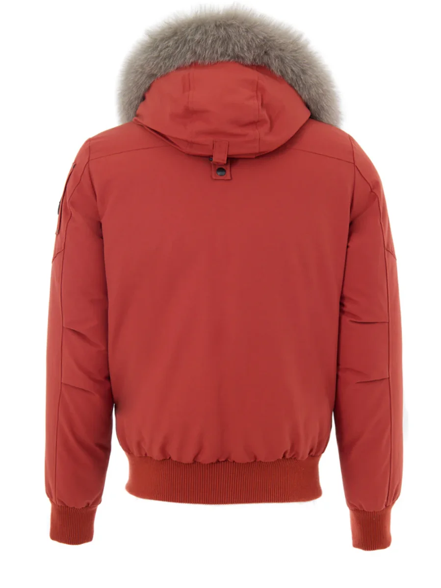 Giubbino Bomber Blu Imbottito Moose Knuckles. Allacciatura frontale con zip nera contrasto, due tasche laterali e due superiori a filetto, fascia in maglina elastica in vita e polsini, cappuccio regolabile e removibile con inserto in pelliccia. Sulla manica patch in tessuto e logo metallico satinato applicato. Fodera interna, dettagli metallici in metallo nero satinato.