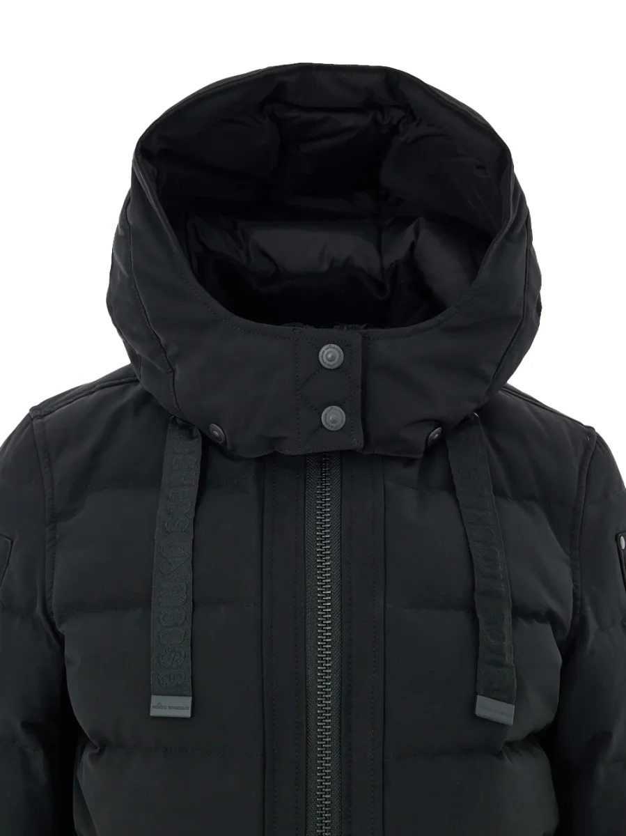 Giubbino Bomber Imbottito in Nero Moose Knuckles. Allacciatura frontale con zip, due tasche laterali chiuse con patta e bottone, fascia elasticizzata in maglina in vita, polsini. Collo a lupetto, cappuccio regolabile e removibile, sulla manica patch con logo applicato. Imbottitura interna