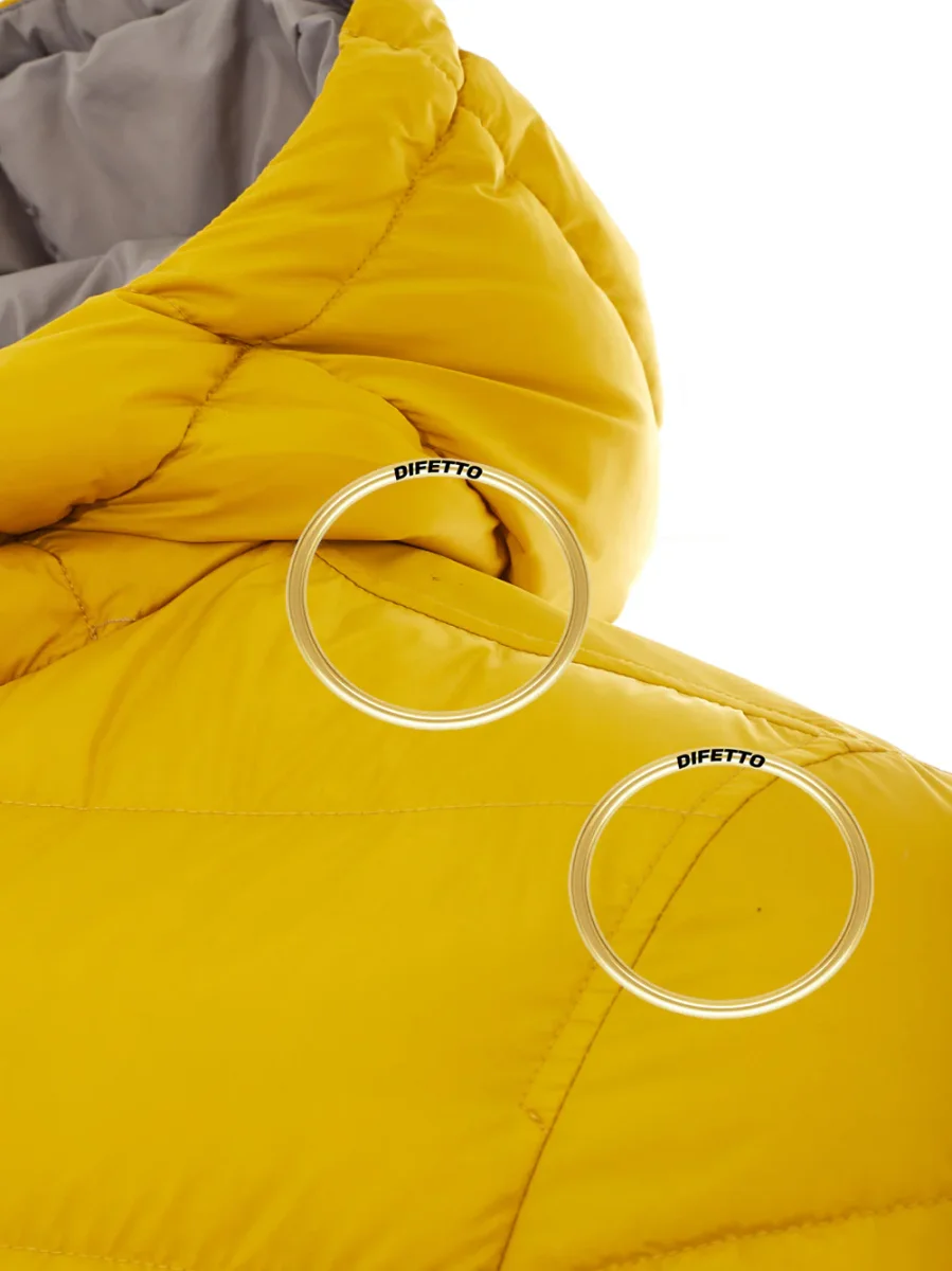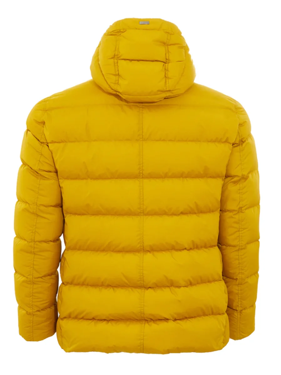 Giubbino Imbottito Herno in giallo, chiusura frontale con zip con doppio cursore tono su tono, due tasche laterali chiuse con zip, cappuccio regolabile con tiranti non removibile. Il prodotto presenta lieve difetto come da immagine. Composizione: 100% Poliammide-Sku interno:DIF23SET76