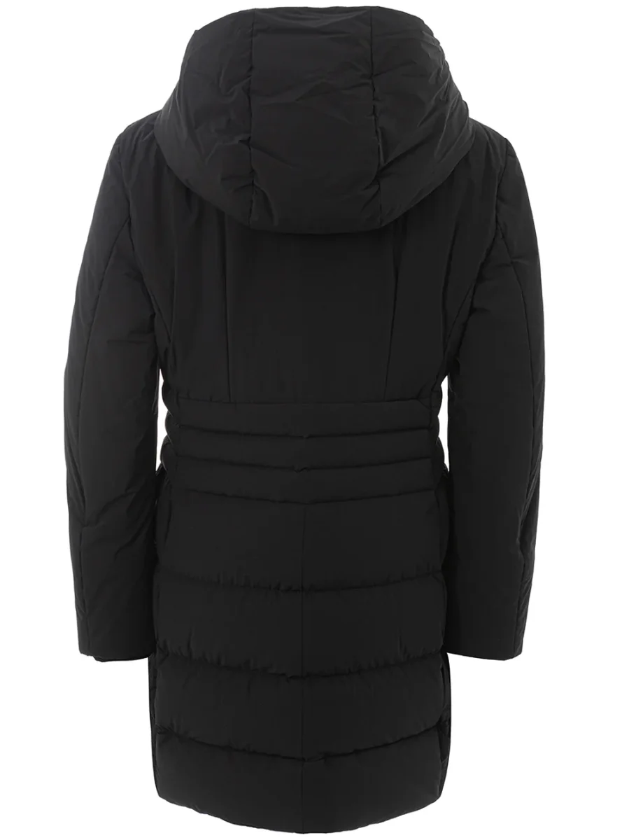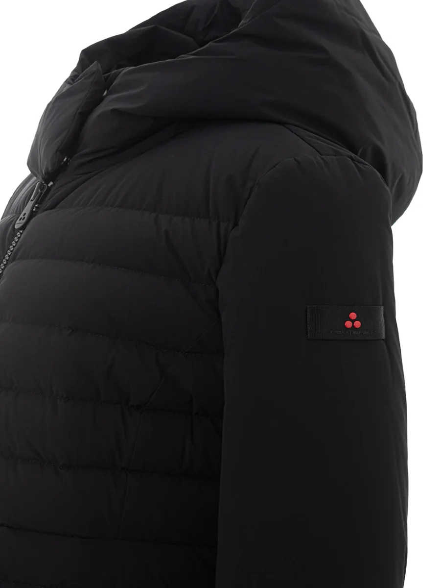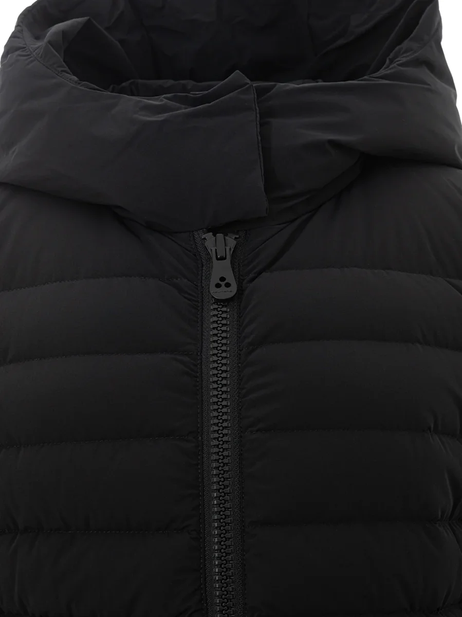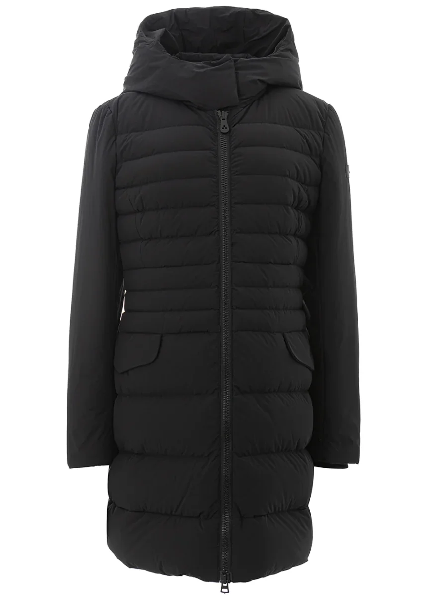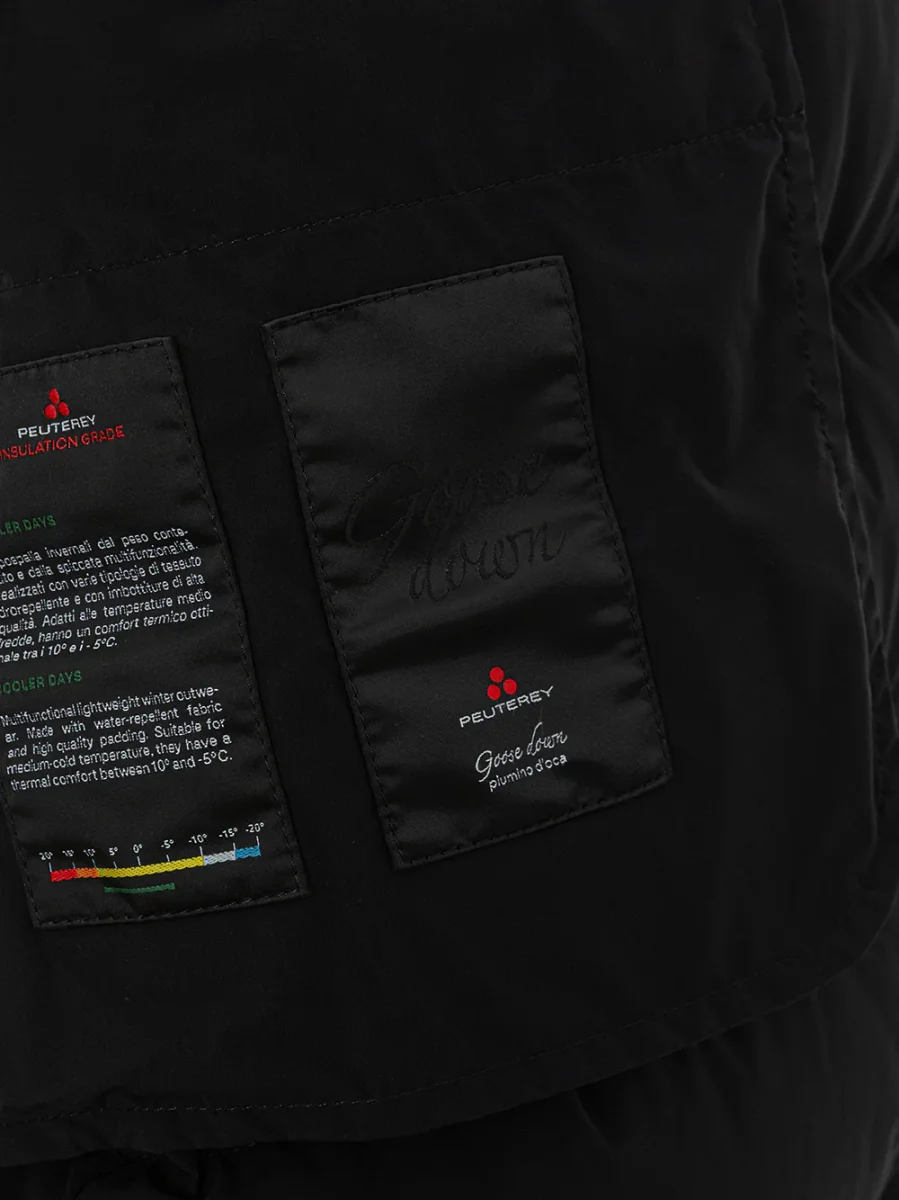 Giubbino Imbottito Lungo Peuterey in nero. Allacciatura frontale con zip a vista, due tasche laterali chiuse con pattine, cappuccio non removibile. Modello lungo, sciancrato in vita, tag con logo sulla manica. Modello: Viho. Composizione: 82% Poliammide, 18% Elastane-Sku interno:24FEB07