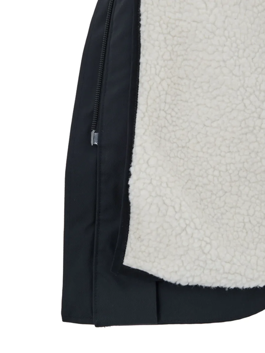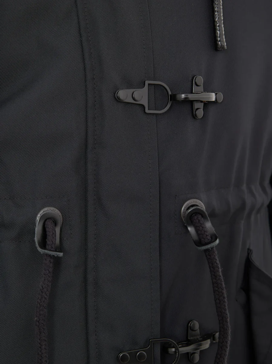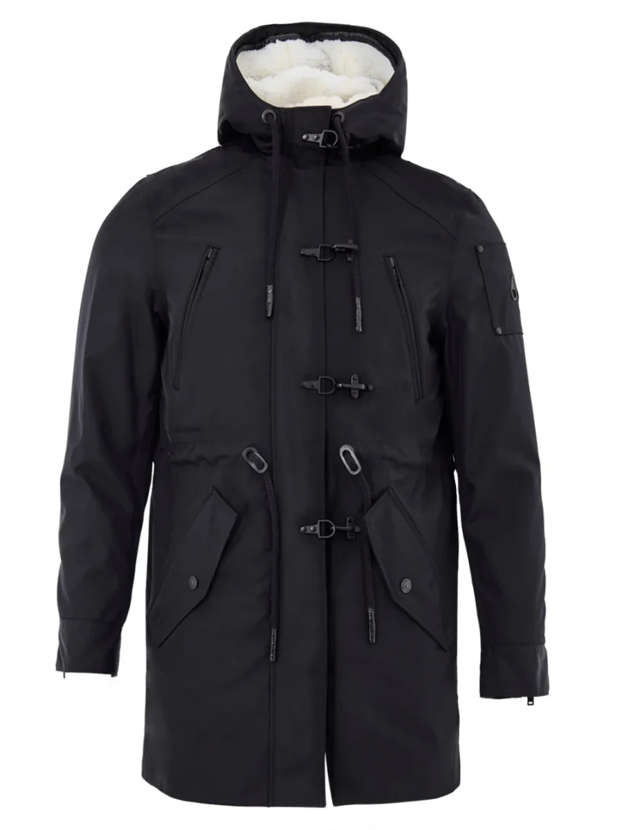 Giubbino Parka Blu con Coulisse Moose Knuckles. Allacciatura frontale con zip e ganci metallici, due tasche laterali a filetto e due superiori, coulisse in vita regolabile. Cappuccio regolabile, sulla manica patch con logo metallico applicato. Internamente rivestito con sheep fur removibile.