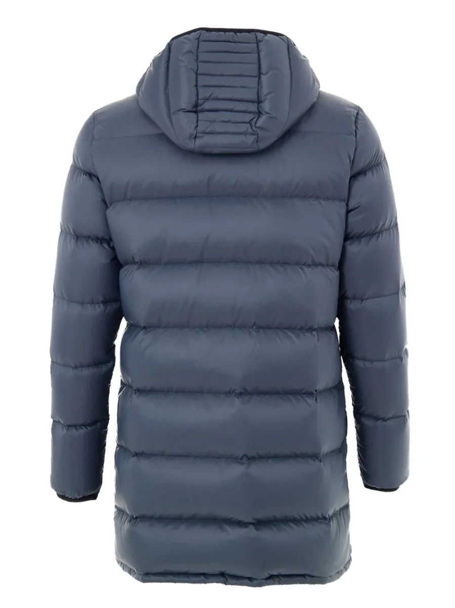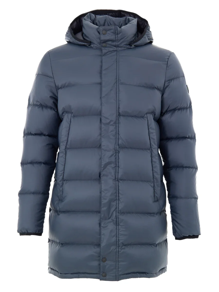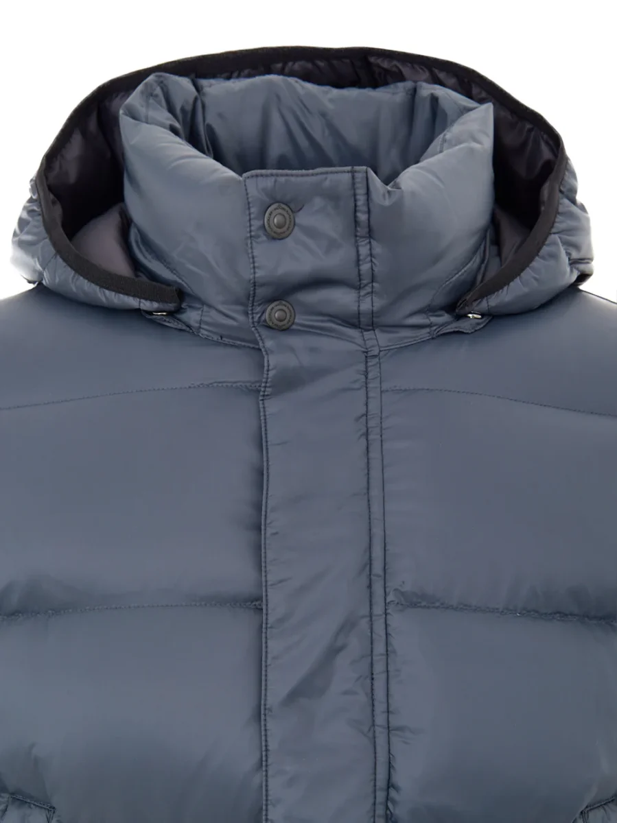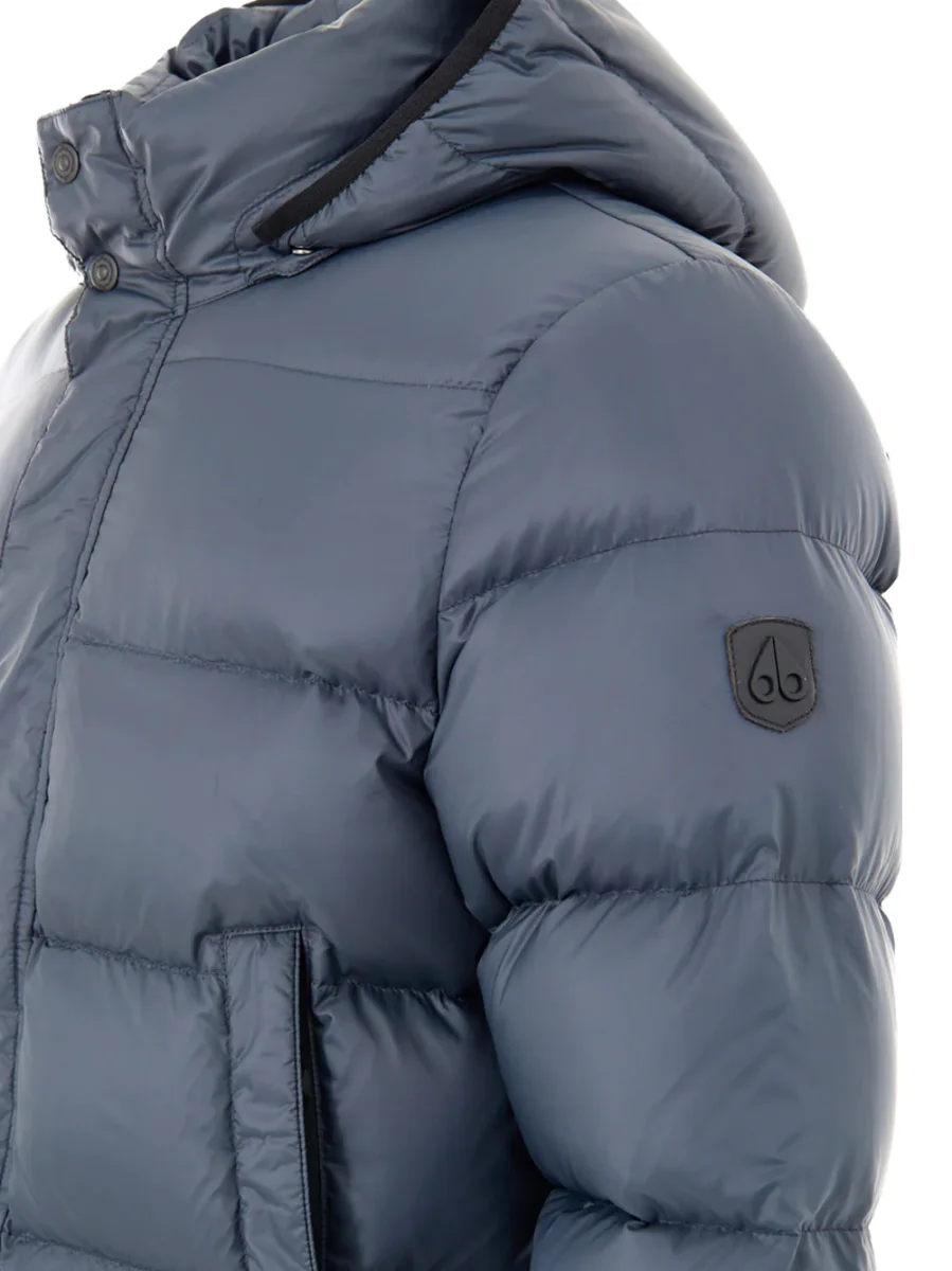 Giubbino PIumino Media Lunghezza in Grigio Moose Knuckles. Allacciatura frontale con zip e bottoni coperti, due maxi tasche ai lati chiuse con zip, cappuccio regolabile e removibile. Sulla manica piccolo patch con logo applicato.