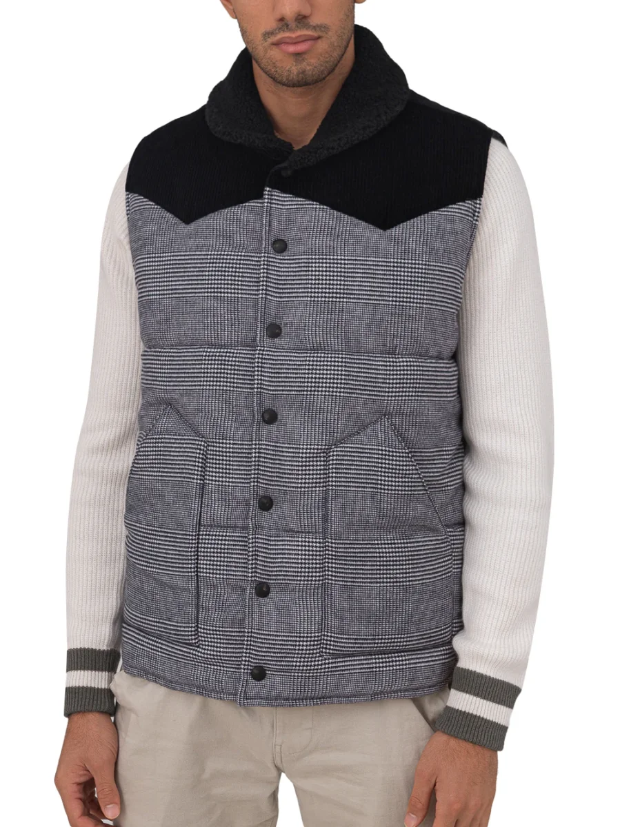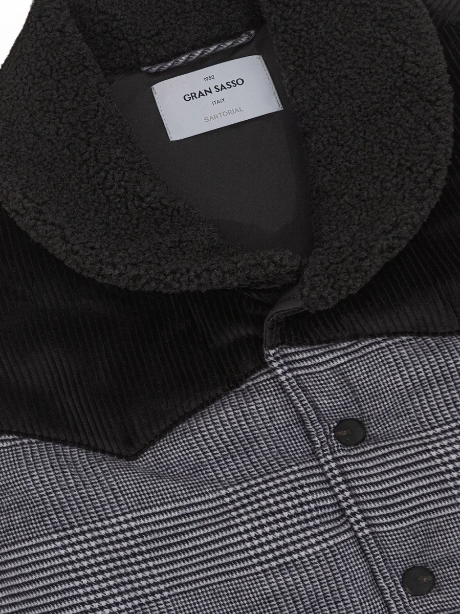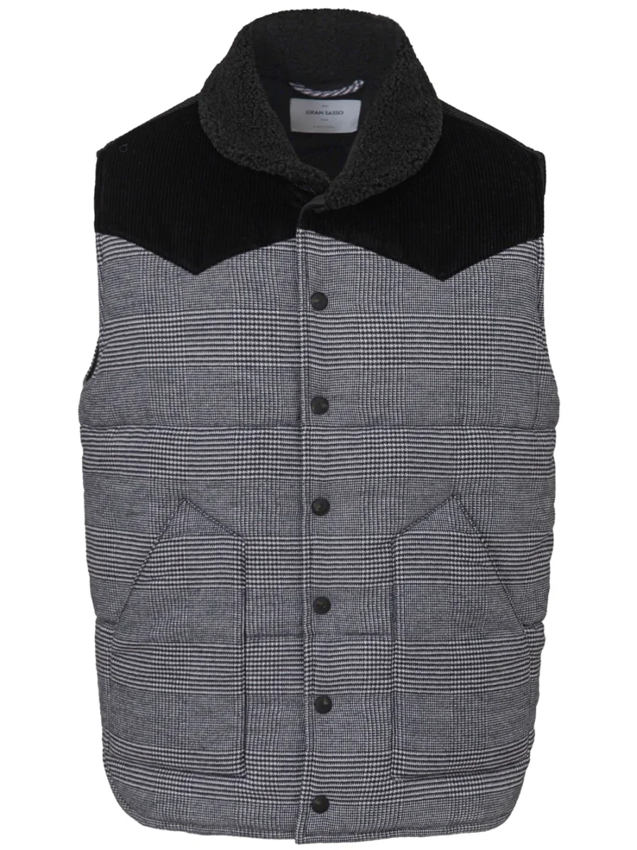 Giubbino Smanicato Imbottito Principe di Galles Gran Sasso. Allacciatura frontale con bottoni automatici a vista, due tasche sul lato, colletto in lana nera con effetto bouclé. Pannello in velluto a costine nero su petto e fronte a contrasto. Modello stondato sul fondo. Composizione: 100% Cotone, 100% Poliestere. Sku Interno: 24SET32