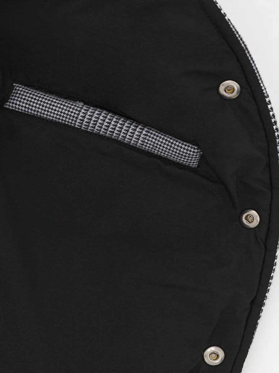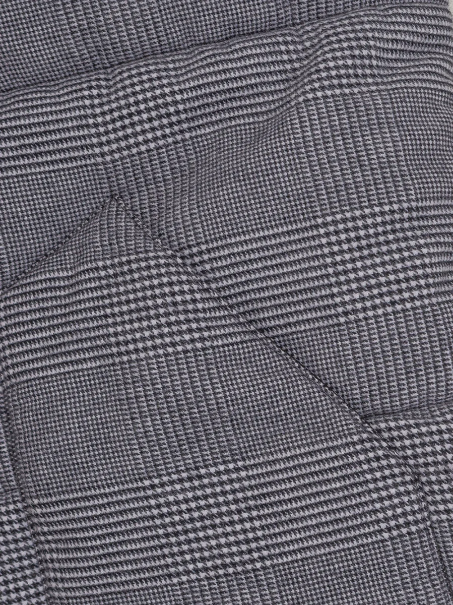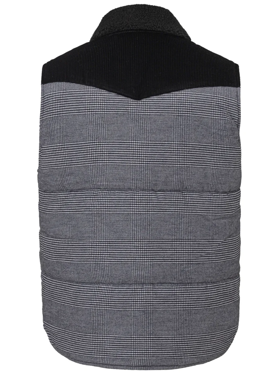 Giubbino Smanicato Imbottito Principe di Galles Gran Sasso. Allacciatura frontale con bottoni automatici a vista, due tasche sul lato, colletto in lana nera con effetto bouclé. Pannello in velluto a costine nero su petto e fronte a contrasto. Modello stondato sul fondo. Composizione: 100% Cotone, 100% Poliestere. Sku Interno: 24SET32