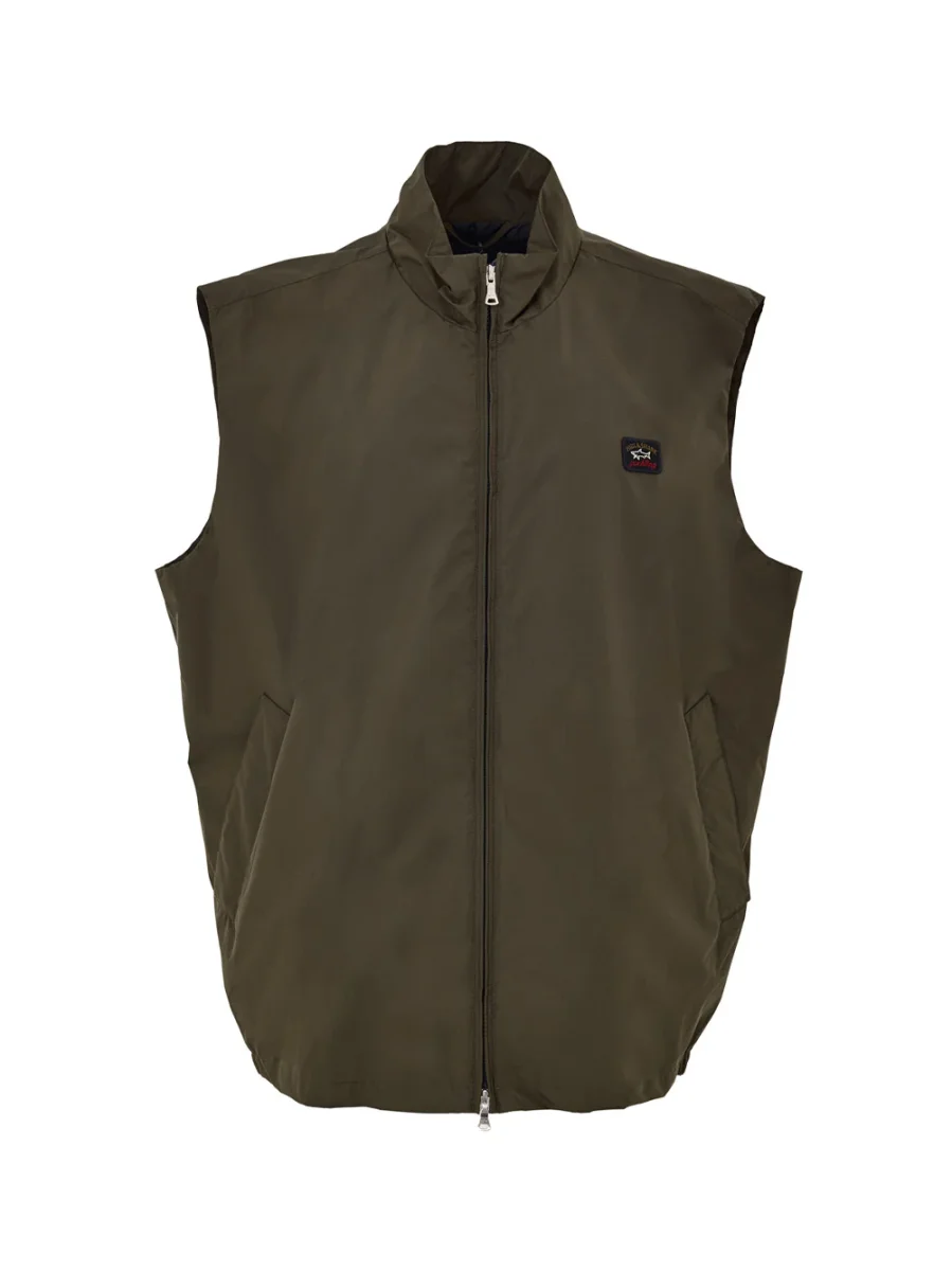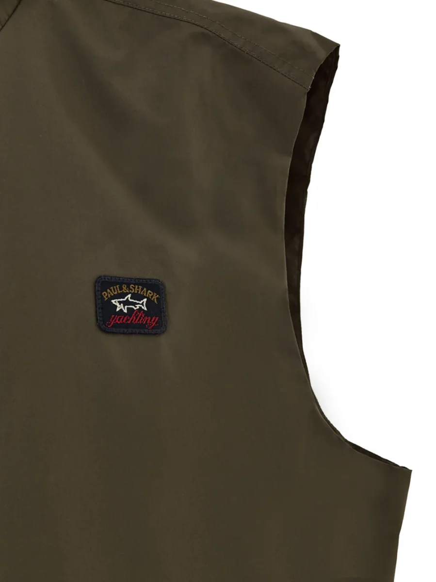 Giubbino Smanicato in Tessuto Tecnico Verde Paul & Shark. Senza maniche, apertura frontale con zip con doppio cursore, due tasche laterali a filetto, elastico in vita sui lati, tasca interna. Fodera interna.