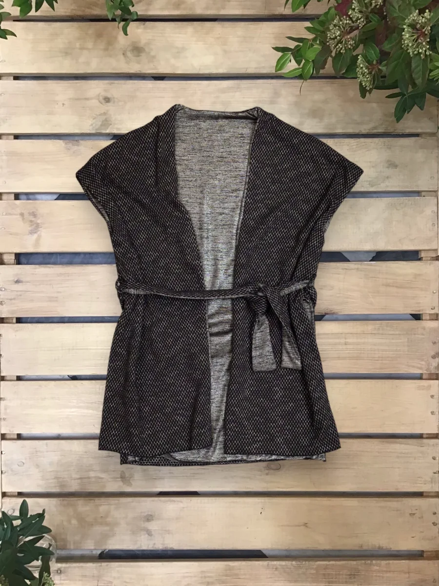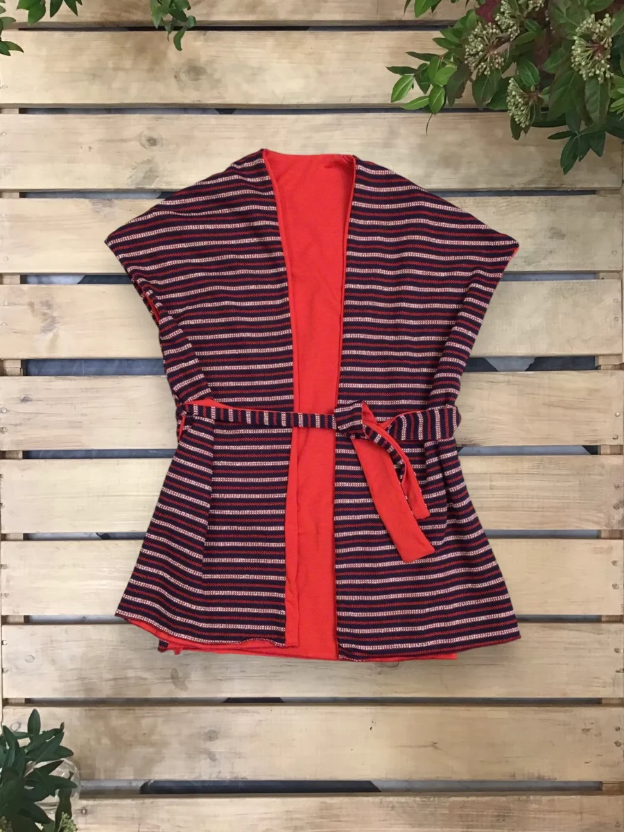 Gilet aperto, doppio e completamente reversibile, con cinturina in vita.