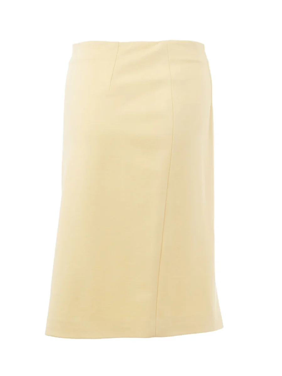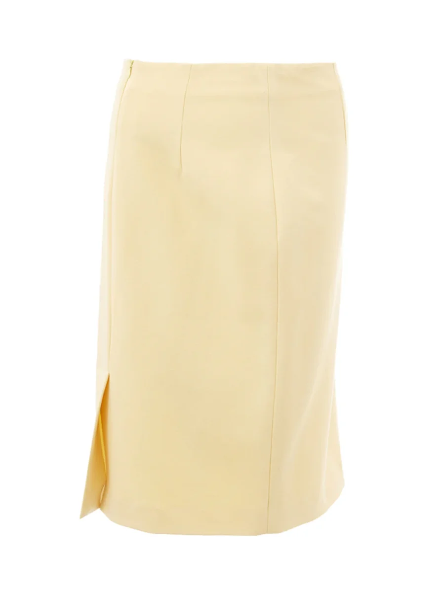 Gonna a Tubino Gialla Lardini con piccolo spacco sul retro e chiusura con zip sul lato posteriore Misure: vita 34 cm, lunghezza 65 cm Composizione: 60% viscosa, 35% Nylon, 5% Gomma-Sku interno:23FE210-211