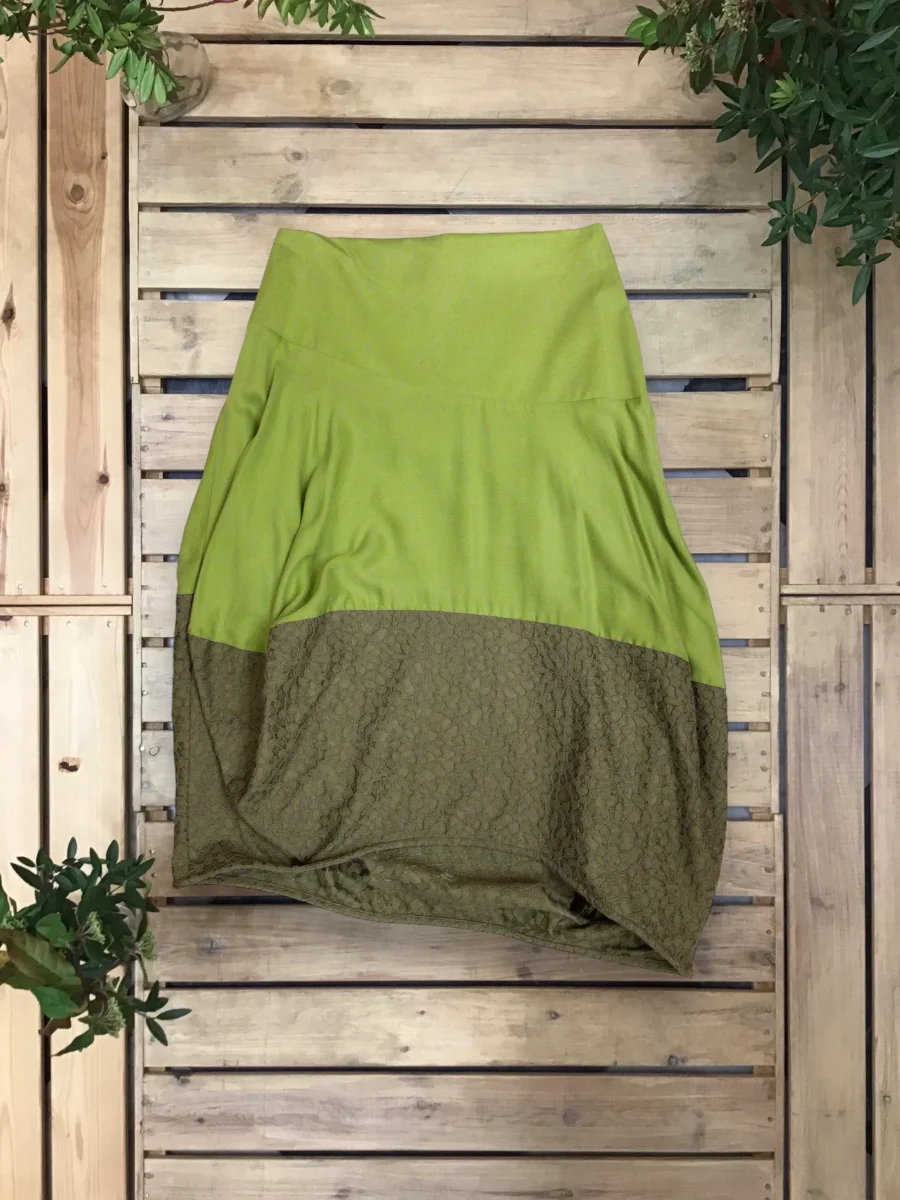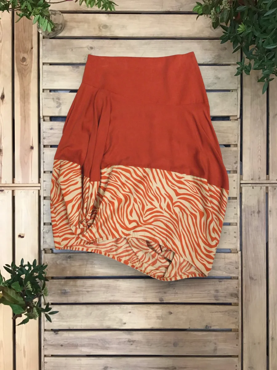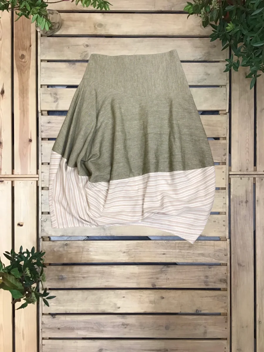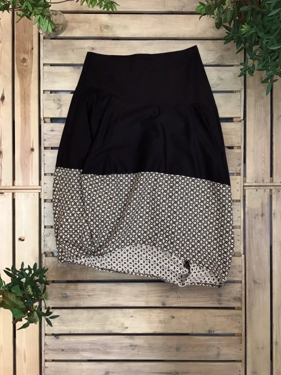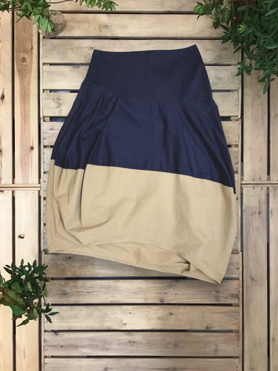 Gonna asimmetrica, a palloncino, con fondo in tessuto a contrasto.
