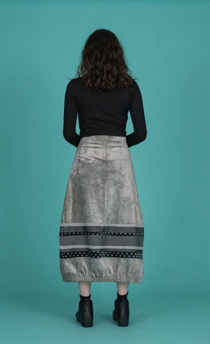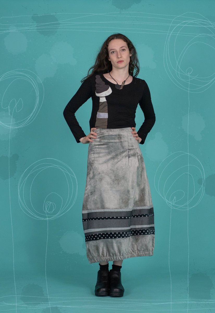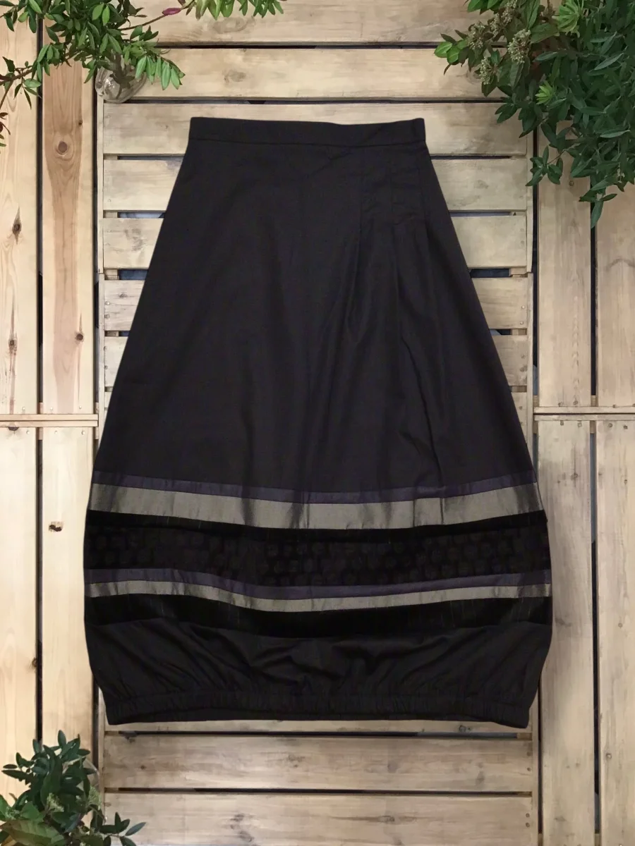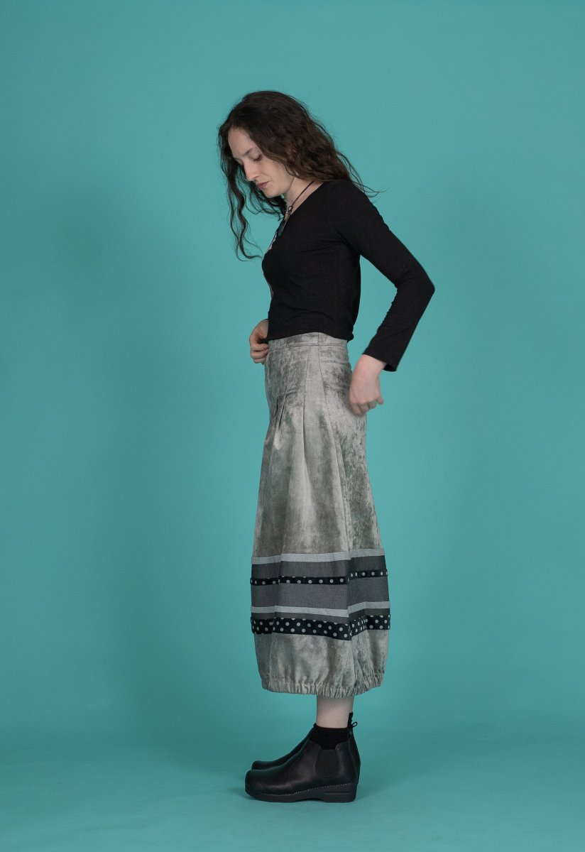 Gonna a palloncino con elastico sul fondo, pieghe asimmetriche sul davanti e striscioline di tessuto a contrasto.