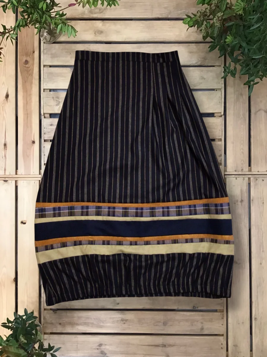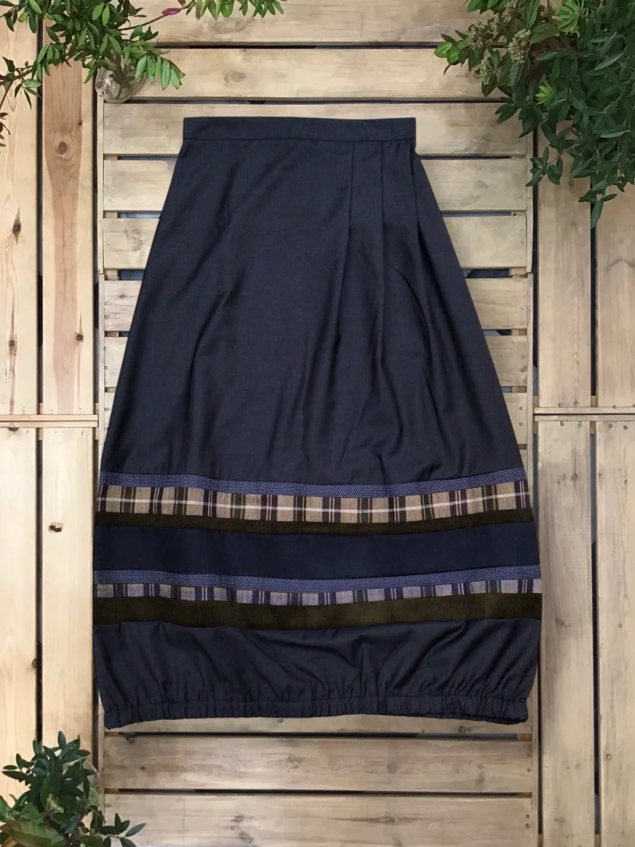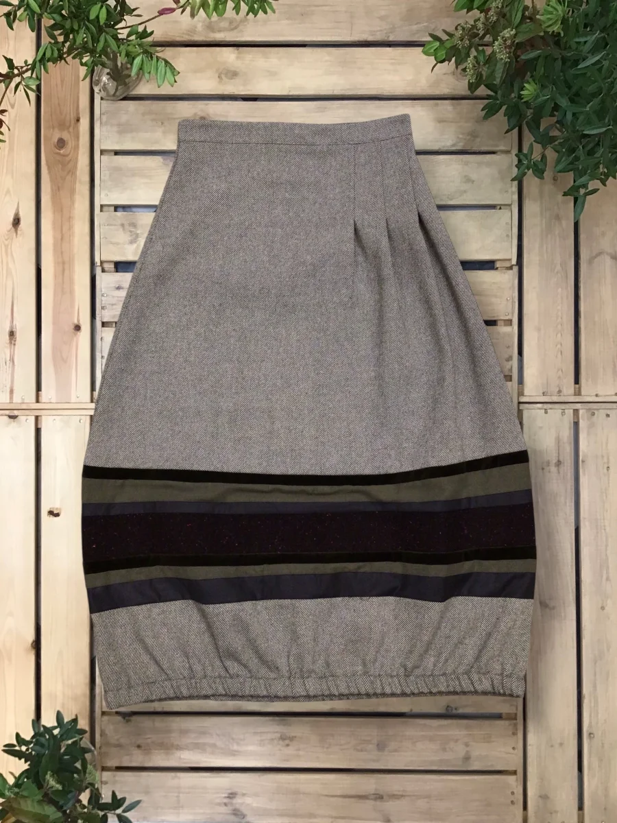 Gonna a palloncino con elastico sul fondo, pieghe asimmetriche sul davanti e striscioline di tessuto a contrasto.