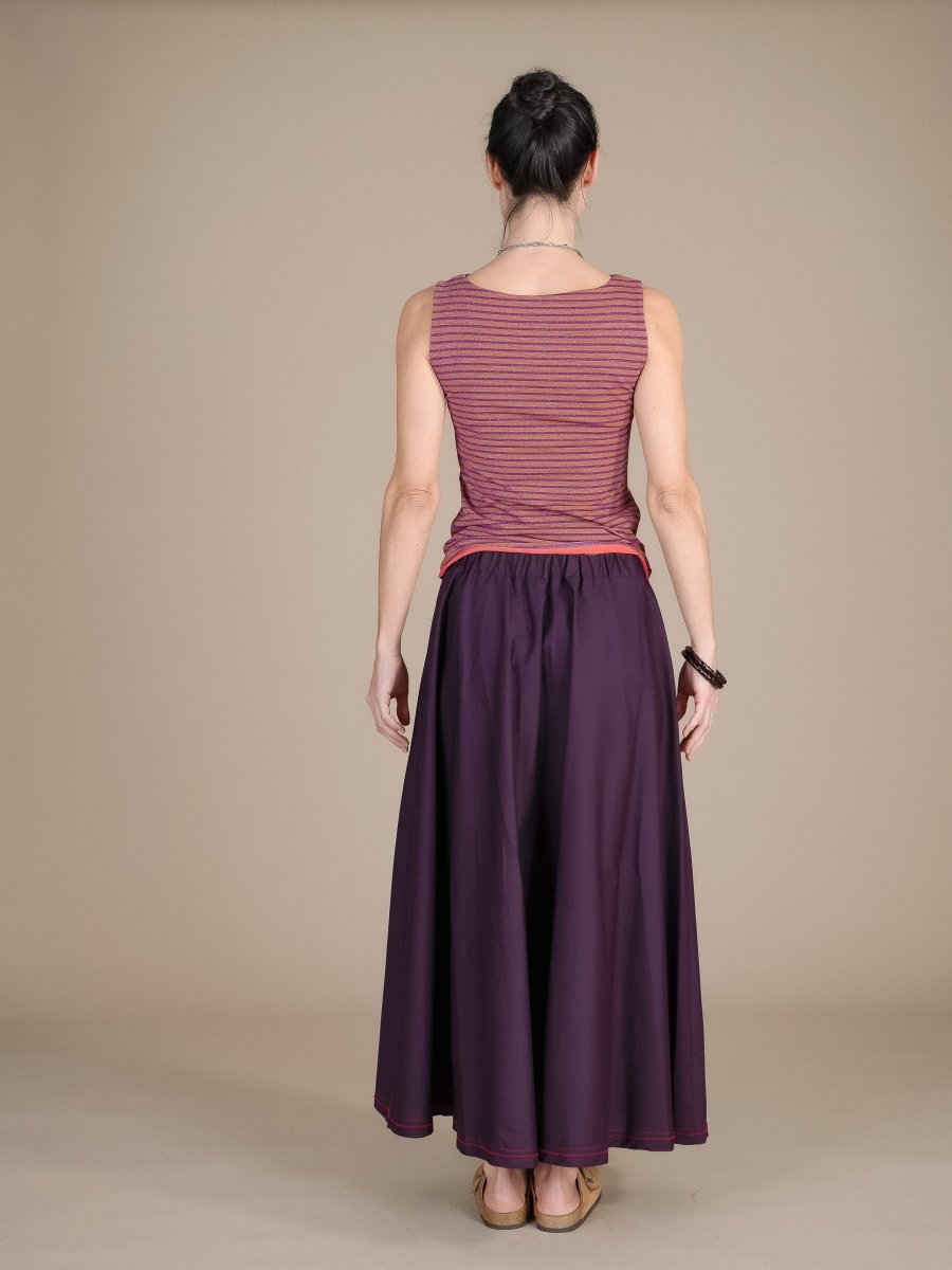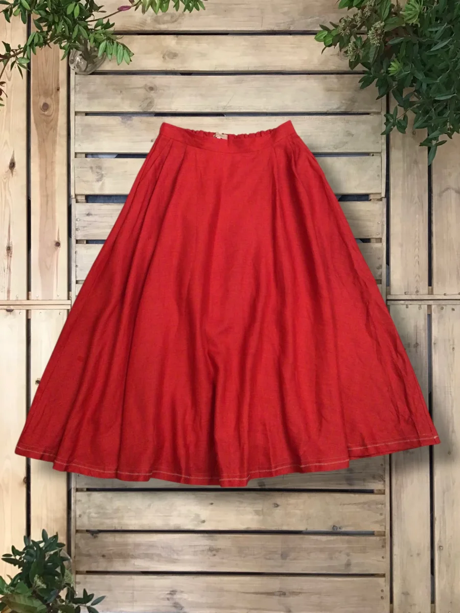 Gonna a mezza ruota con pieghe ed elastico inserito nel cinturino dietro, ricamata sul fondo.