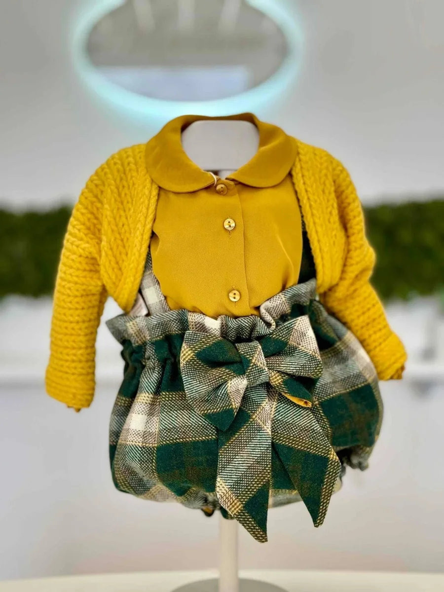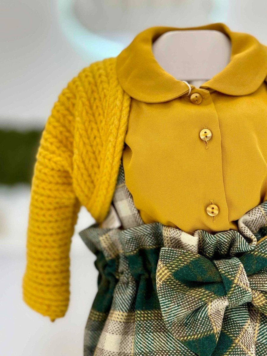 Completo tre pezzi composto da salopette in verde scozzese con fiocco, camicia senape e cardigan senape