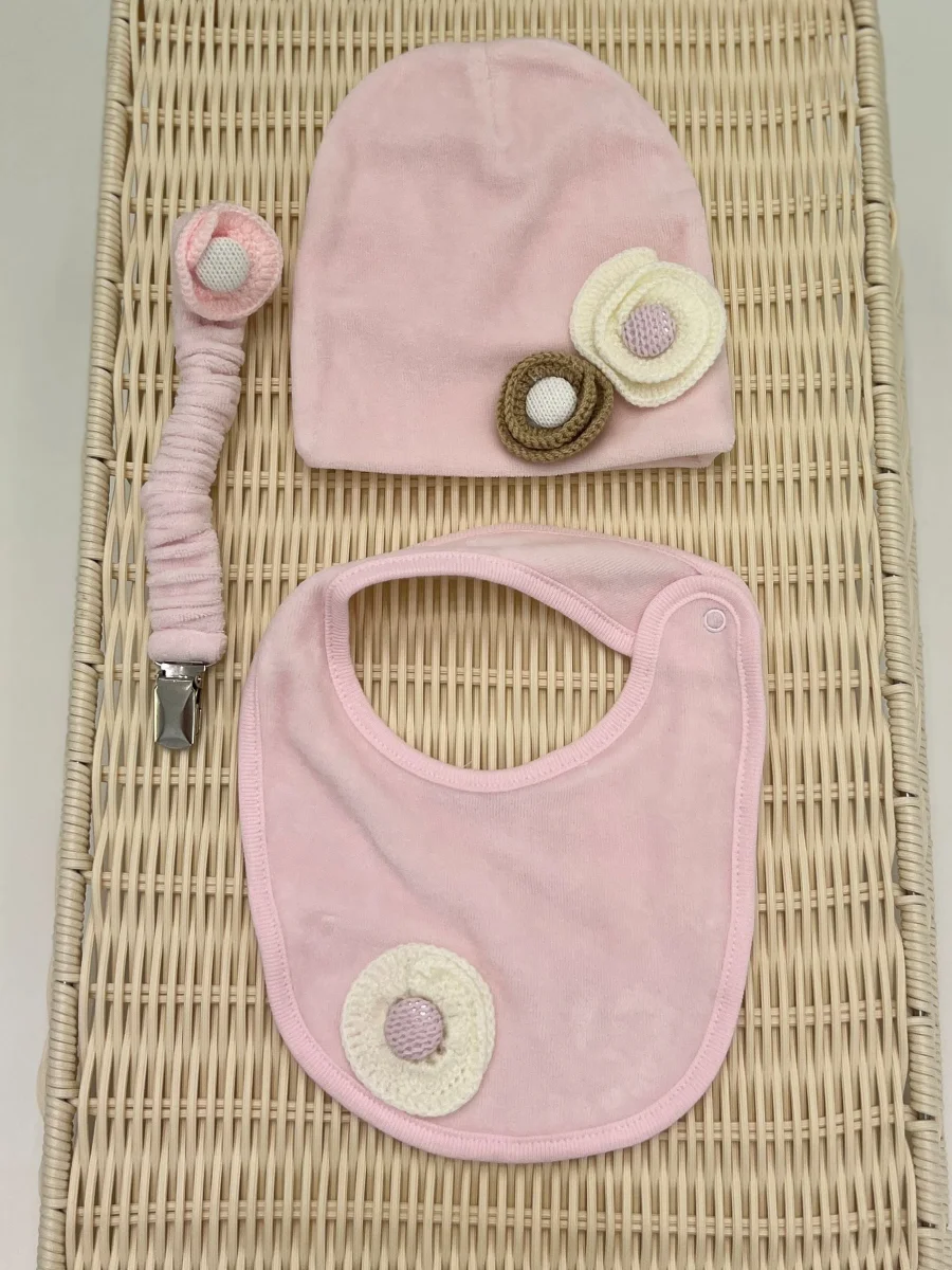 questo tenero set di accessori comprende un cappellino, una bavetta ed un portaciuccio realizzati in morbida ciniglia, per offrire alla tua piccola calore e comfort senza rinunciare allo stile curato in ogni minimo dettaglio.