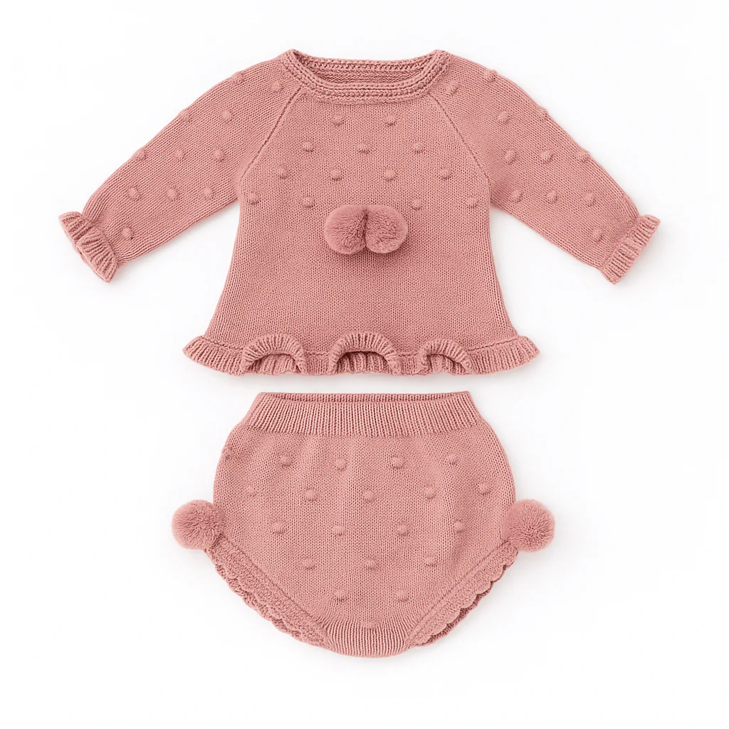 Completo in maglia con lavorazione a pois e pompon applicati, balza ondulata e culotte coordinata. Un modello originale e sofisticato.