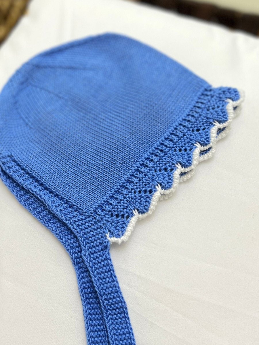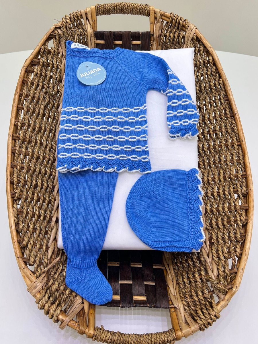 Completo clinico neonato con cuffia in filo di cotone, con trama ricamata in bianco.