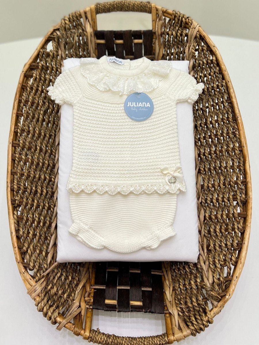 Completo due pezzi neonata in filo di cotone lavorato, con coulotte e rouches in merletto.