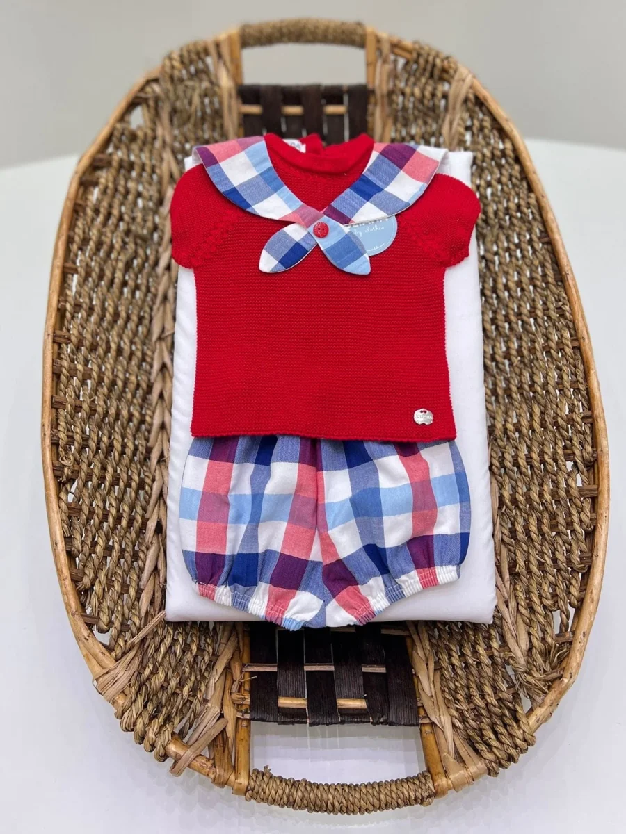Completo due pezzi neonato in filo di cotone. Pantaloncino in cotone con fantasia a quadri e maglia con collo alla marinara.
