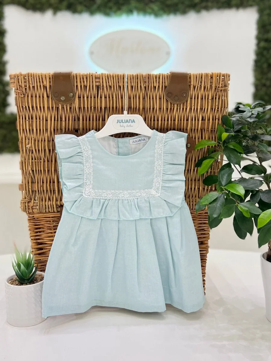 Abito neonata in misto lino verde acqua. Manica a giro e taglio in vita quadrato con rouches e merletto.