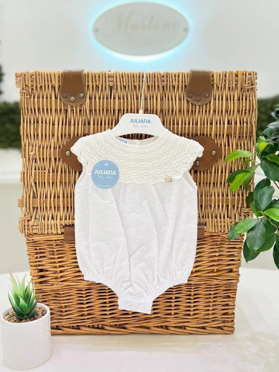 Pagliaccetto neonata in plumetis e girocollo con rouches in filo di cotone lavorato.