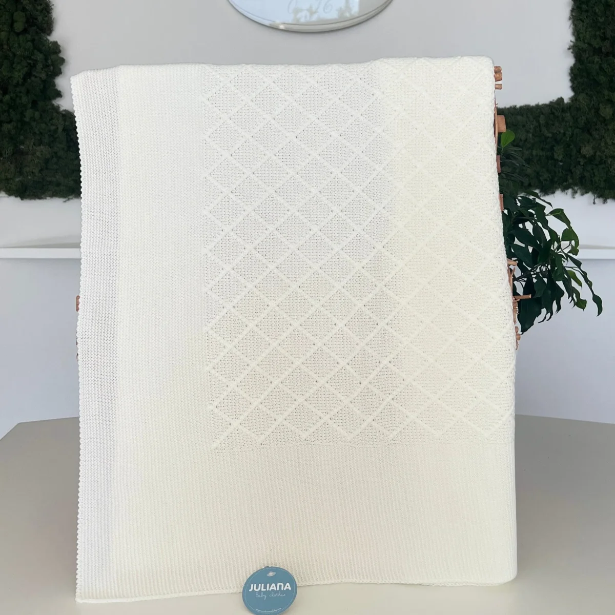 Lo scialle per neonato in lana sintetica bianca è un accessorio delicato e raffinato, perfetto per avvolgere il piccolo con calore e comfort. Il tessuto, realizzato in morbida lana sintetica, è ideale per la pelle sensibile del neonato. La lavorazione a maglia con motivo a rombi aggiunge un tocco di eleganza e una texture ricca, rendendo lo scialle visivamente accattivante. Il colore panna conferisce un aspetto classico e versatile, adatto a qualsiasi occasione. Questo scialle combina funzionalità e stile, offrendo protezione e bellezza in un unico capo.