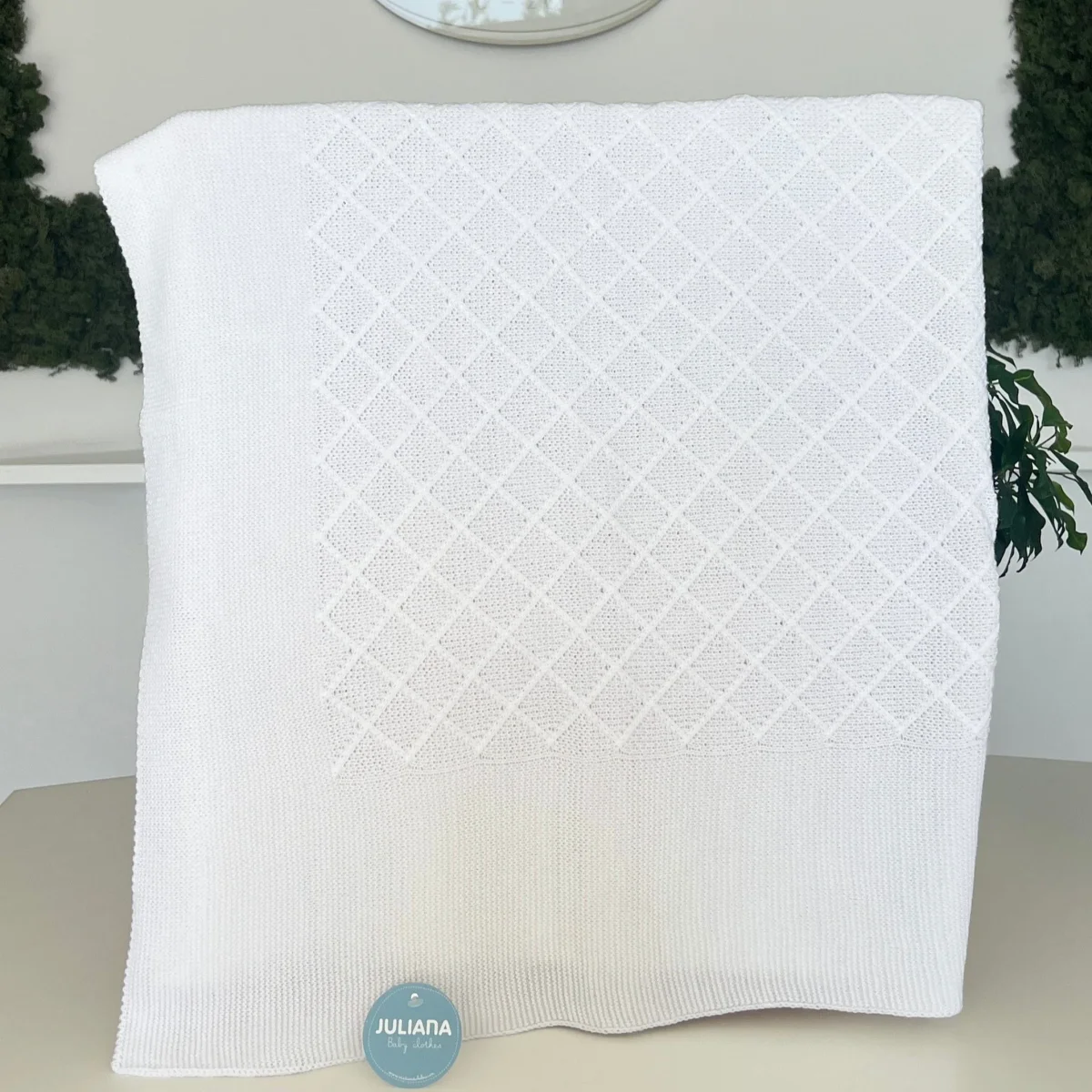 Lo scialle per neonato in lana sintetica bianca è un accessorio delicato e raffinato, perfetto per avvolgere il piccolo con calore e comfort. Il tessuto, realizzato in morbida lana sintetica, è ideale per la pelle sensibile del neonato. La lavorazione a maglia con motivo a rombi aggiunge un tocco di eleganza e una texture ricca, rendendo lo scialle visivamente accattivante. Il colore bianco puro conferisce un aspetto classico e versatile, adatto a qualsiasi occasione. Questo scialle combina funzionalità e stile, offrendo protezione e bellezza in un unico capo.