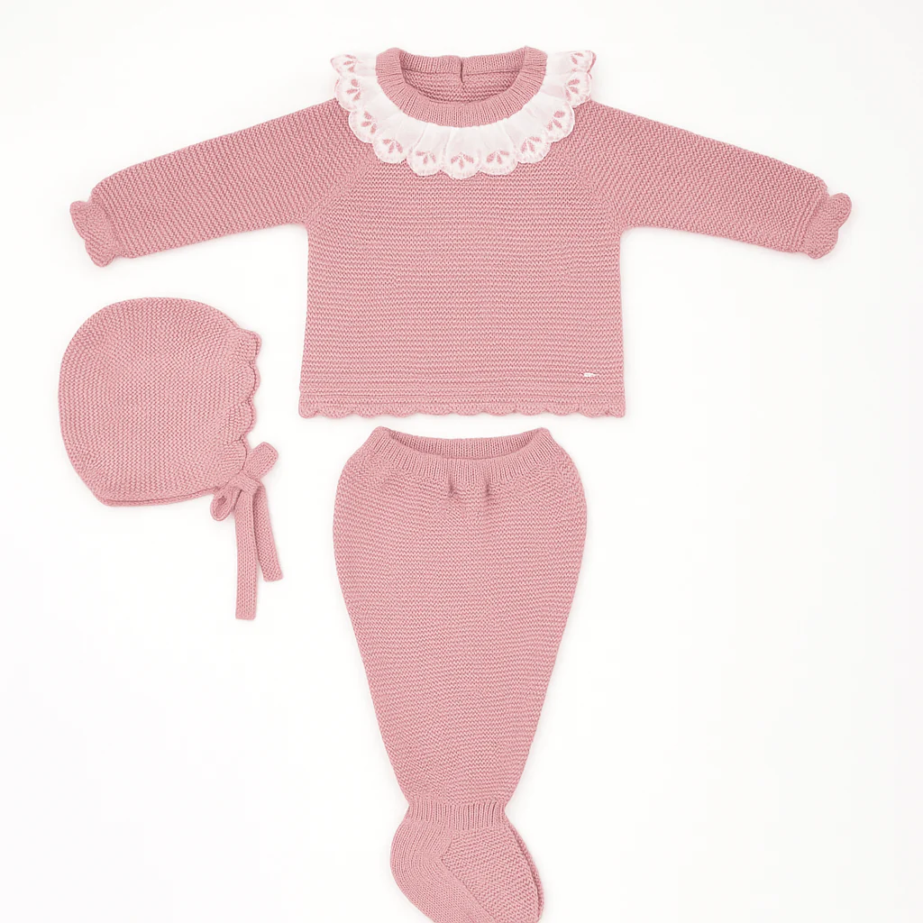 Completo in maglia composto da maglia a manica lunga con colletto ricamato in sangallo, pantalone con piedini e cuffietta coordinata. Un set armonioso dalla cura sartoriale.