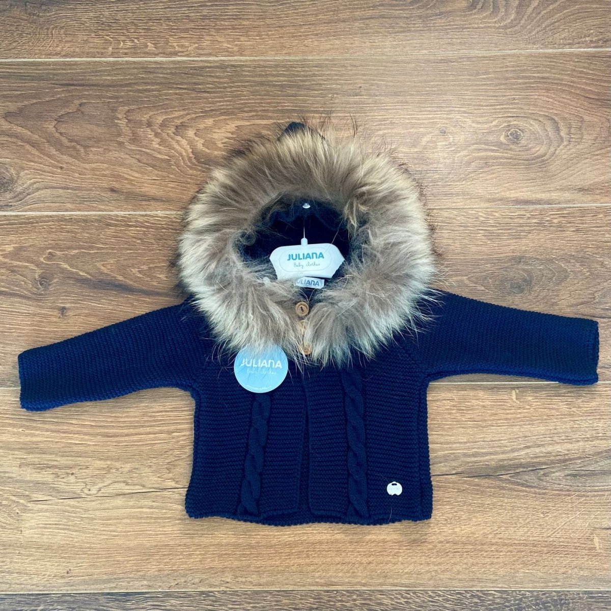 Cappottino con trecce e cappuccio con bordi in pelliccia.