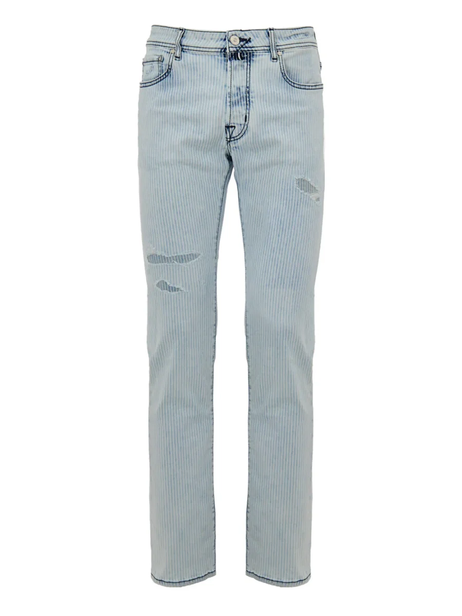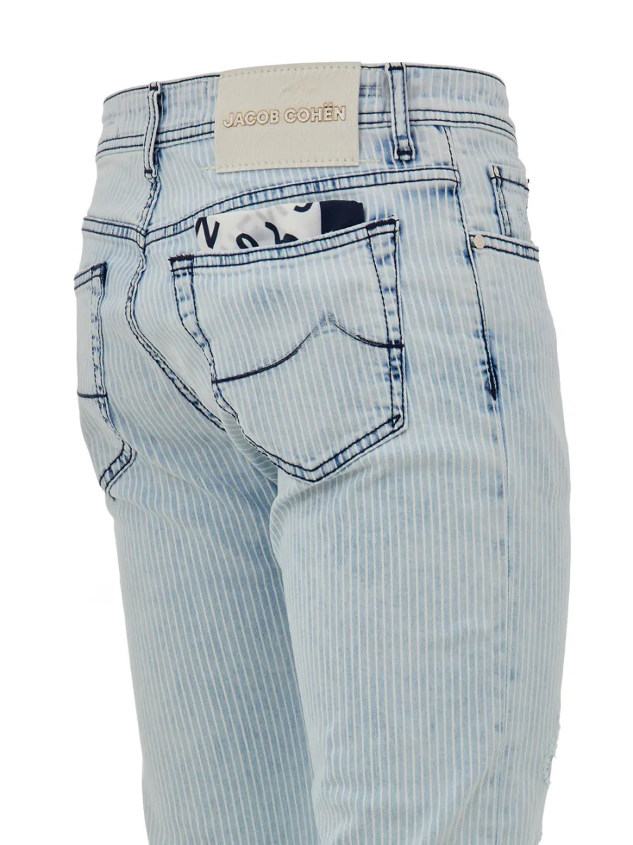 In cotone stretch azzurro a righe con piccoli strappi, cinque tasche, allacciatura con bottone metallico e bottoni coperti, regular slim fit, ricamo J sul taschino. Sul retro tag in cavallino bianco con logo applicato, impunture blu scure a contrasto. In vendita con bandana in cotone e profumati con esclusiva fragranza Jacob Cohen.