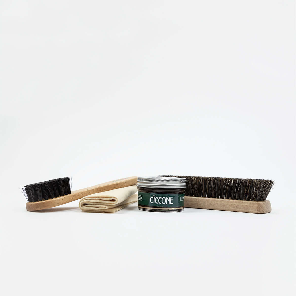 Kit completo di lucido e spazzole per la pulizia di scarpe e accessori in pelle. Il kit Ciccone è completo di lucido, spazzole e accessori per la pulizia delle scarpe in pelle, elegante scatola regalo completa di tutto. Il box contiene: 1lucido (nero, testa di moro o neutro), una spazzole in crine di cavallo per non graffiare la pelle, un panno morbido per lucidare la scarpa e uno spazzolino spandi lucido in crine di cavallo. In fase di acquisto è comunque possibile scegliere il colore dei lucido.
