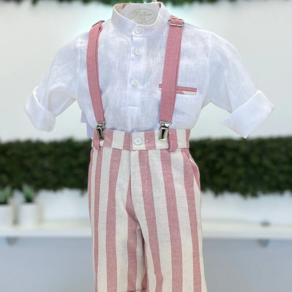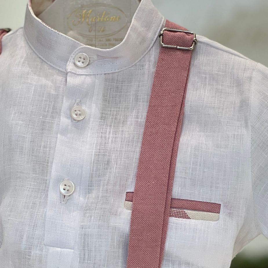 Completo bimbo composto da bermuda in cotone operato con fantasia a righe, camicia coreana in lino e bretelle.