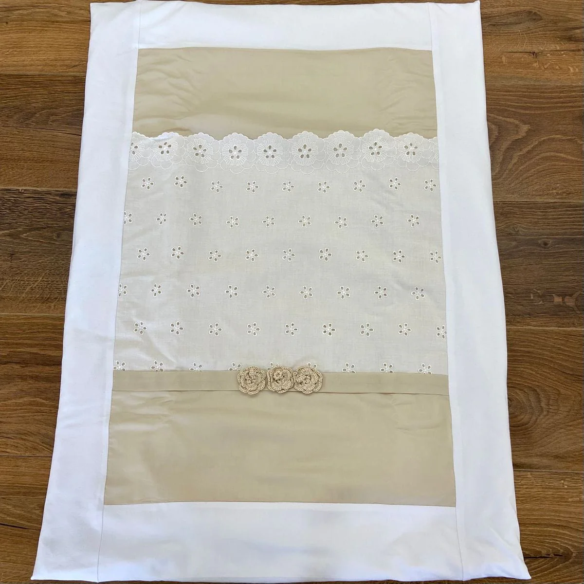 Copertina sfoderabile con applicazione di pizzo san gallo.