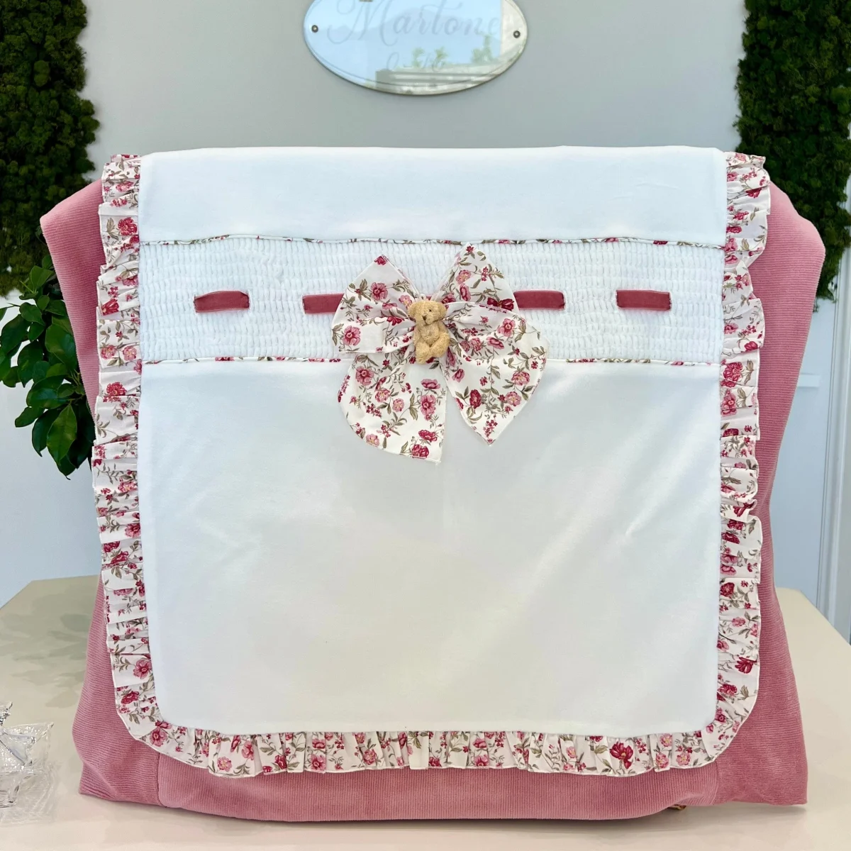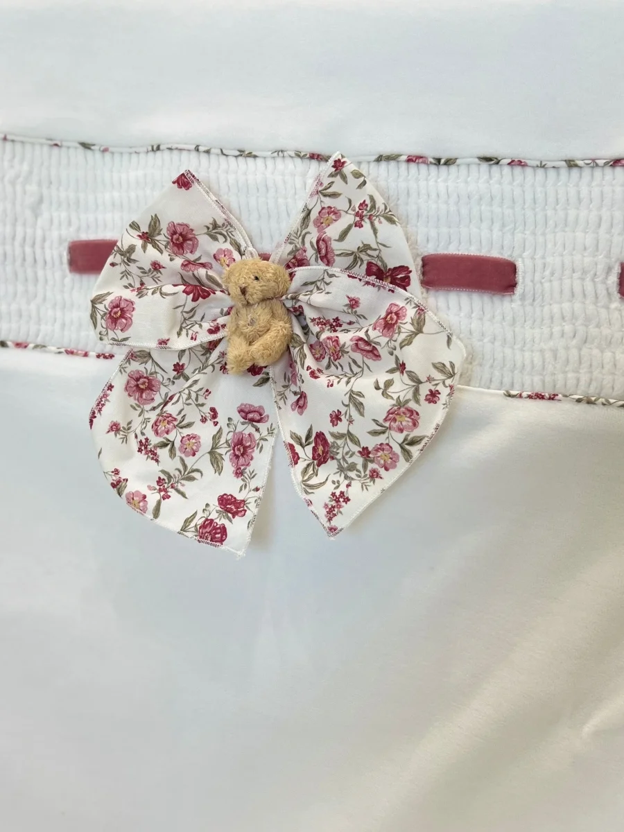 Copertina invernale neonata in ciniglia foderabile. Questo capo offre un tocco di calore e comfort, con il punto smock che non solo conferisce un aspetto sofisticato, ma garantisce anche una sensazione di avvolgente morbidezza, il tutto accompagnato da un tenero orsetto.