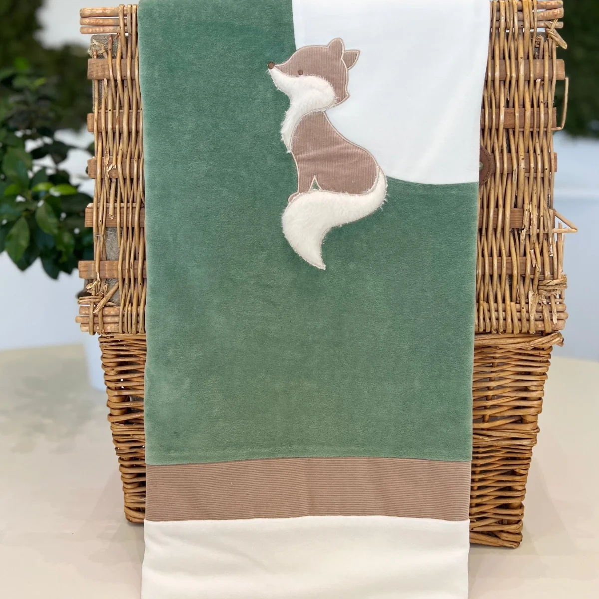 Questa coperta invernale per neonato, realizzata in morbida ciniglia color verde salvia, è adornata con una volpe in peluche ricamata. Calda e accogliente, offre un comfort extra durante i mesi freddi, combinando un design elegante e un tenero dettaglio che aggiunge un tocco di dolcezza.