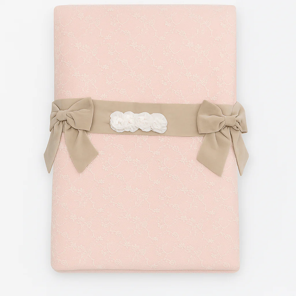 Coperta rosa cipria con strato in pizzo sovrapposto, impreziosita da nastro beige con fiocchi laterali e applicazioni floreali centrali. Una proposta elegante e ricercata