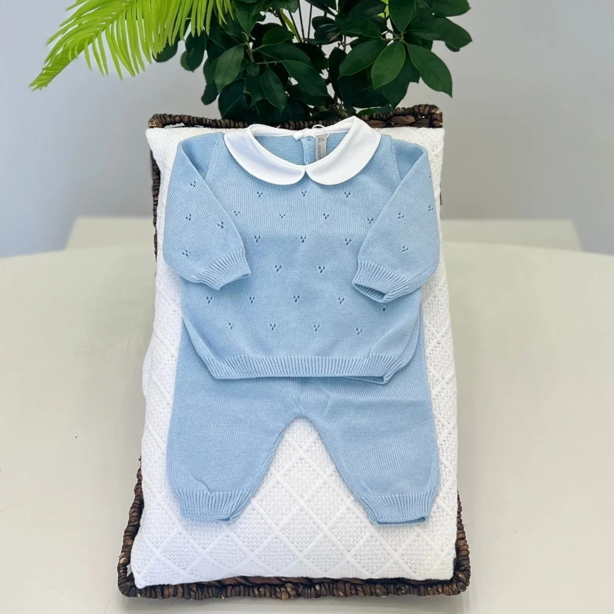 Tutina spezzata in filo di cotone celeste, con maglia traforata e colletto in piquet. Morbida e traspirante, perfetta per accogliere il tuo bebè con delicatezza.