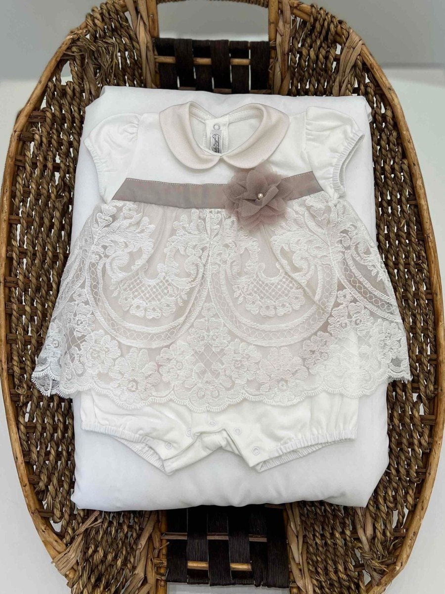 Pagliaccetto neonata in cotone e tulle ricamato.
