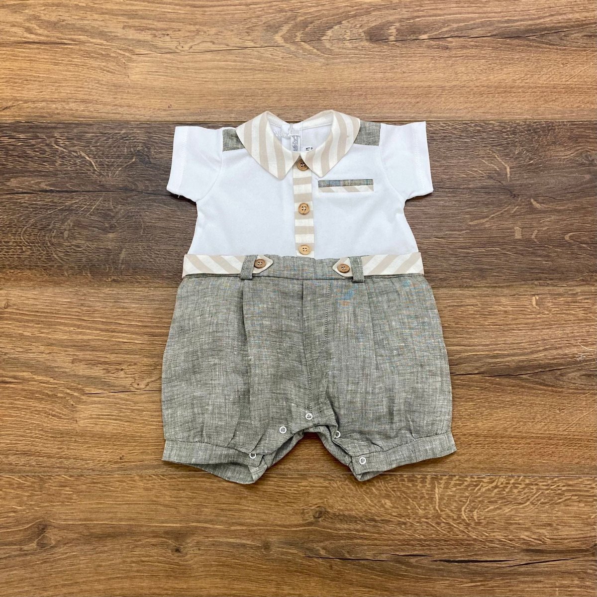 Pagliaccetto in lino con corpetto in cotone con colletto rigato con il beige.