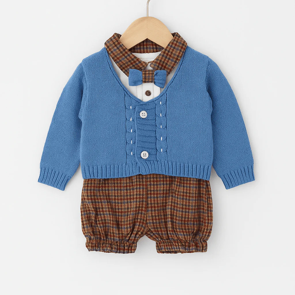 Completo bimbo composto da cardigan in maglia azzurra con lavorazione intrecciata e chiusura frontale a bottoni, abbinato a camicia con colletto e papillon coordinato. I pantaloncini a quadri, con fondo elasticizzato, completano un insieme classico e raffinato, perfetto per le occasioni speciali.