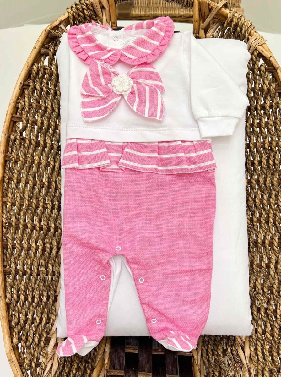 Tutina nascita neonata in cotone e lino con corpetto bianco e colletto rotondo.