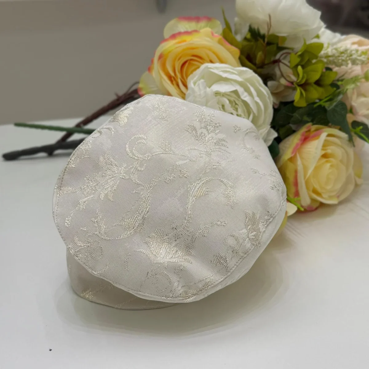 Coppola in tessuto jacquard coordinato, impreziosita da eleganti trame tono su tono con delicati riflessi dorati. Struttura definita e vestibilità confortevole, pensata per completare con stile e coerenza gli outfit da cerimonia più ricercati. Un dettaglio distintivo che aggiunge carattere e raffinatezza all’intero look.