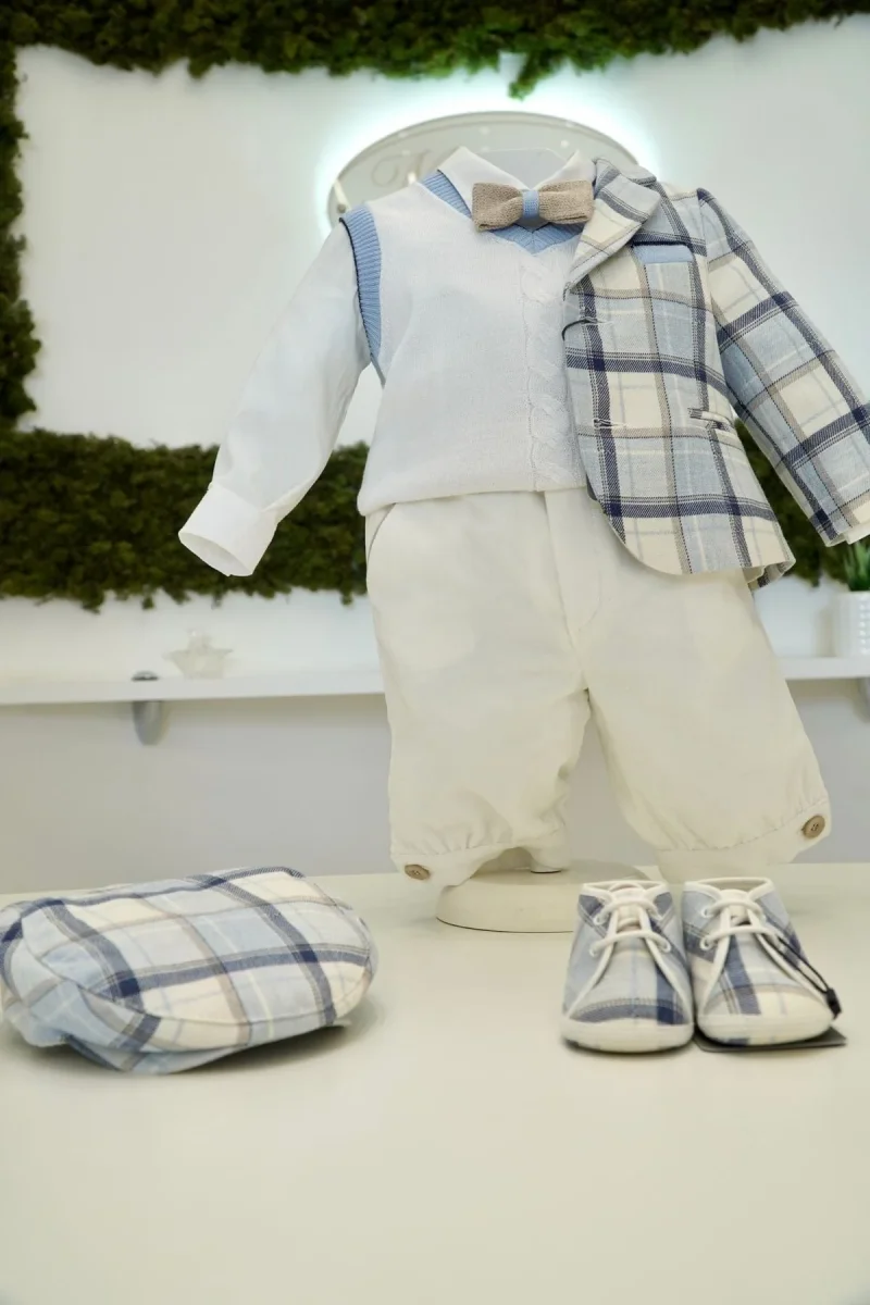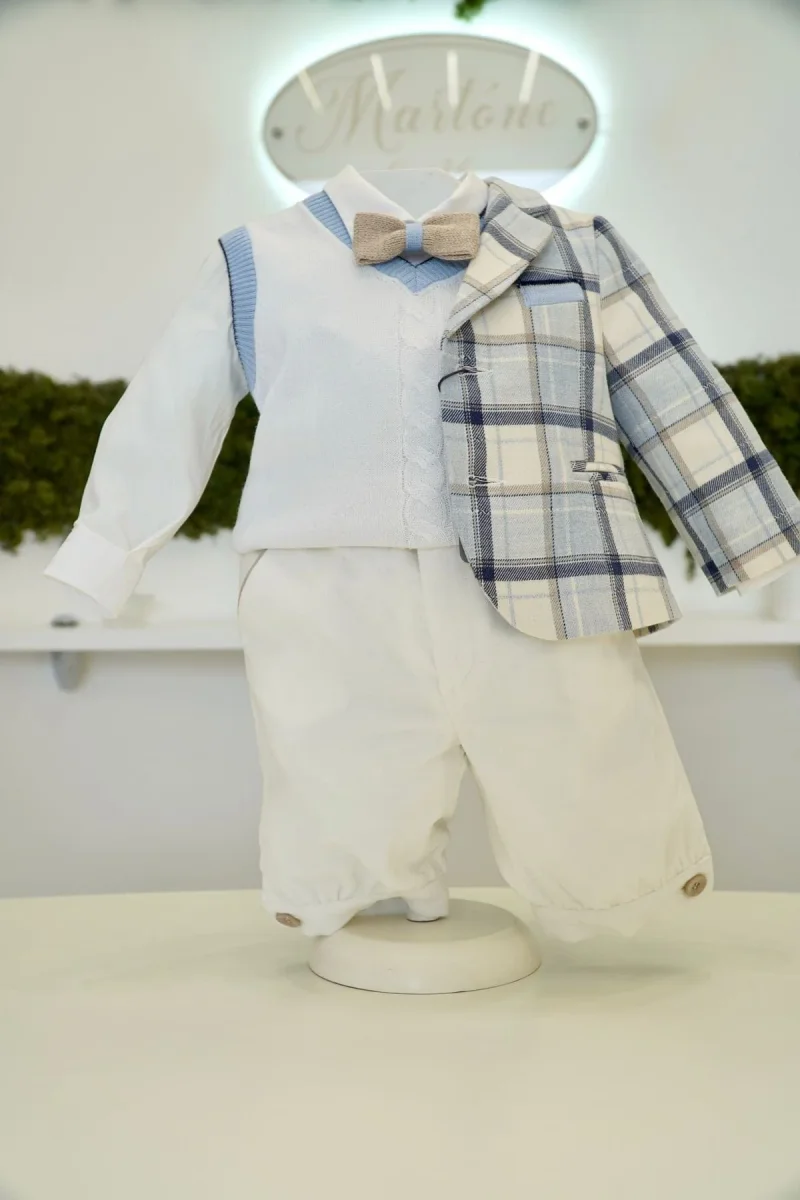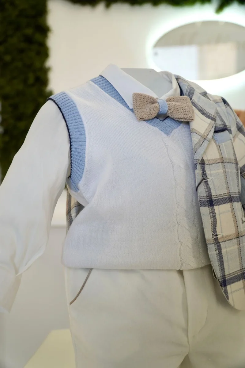 Completo elegante composto da Pantalone in panna, Giacca a quadri in celeste epanna, cardigan smanicato in panna, camicia e papillon in beige